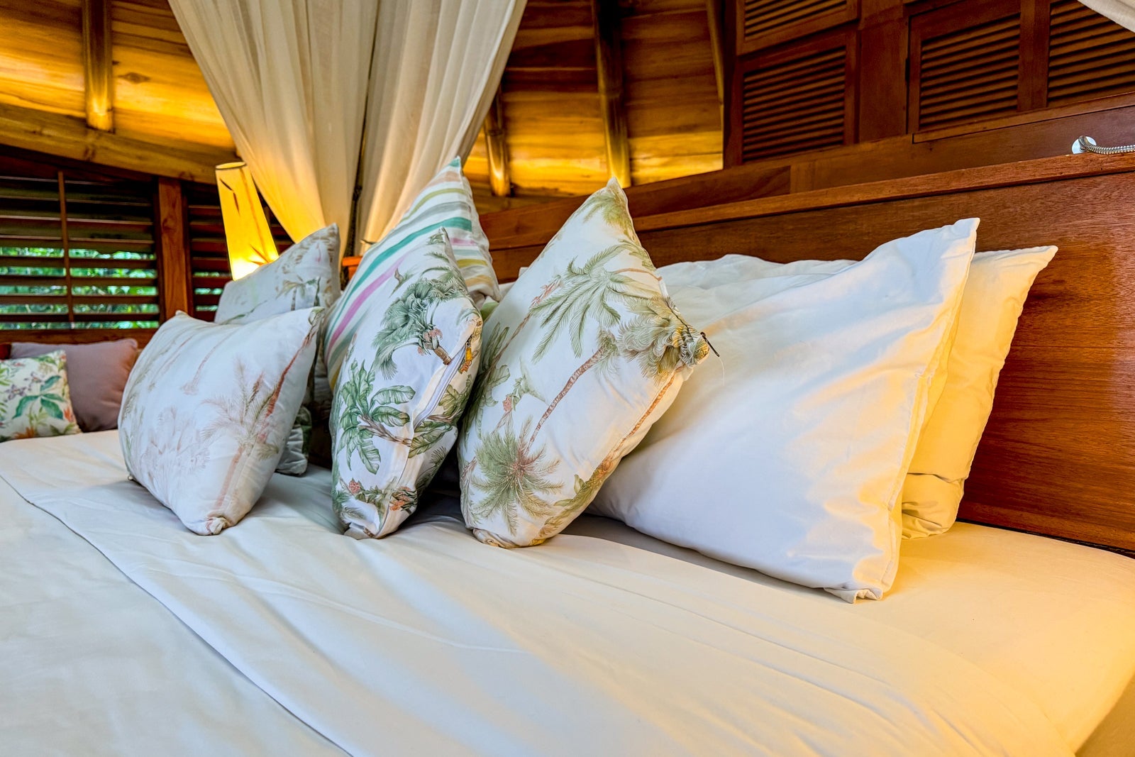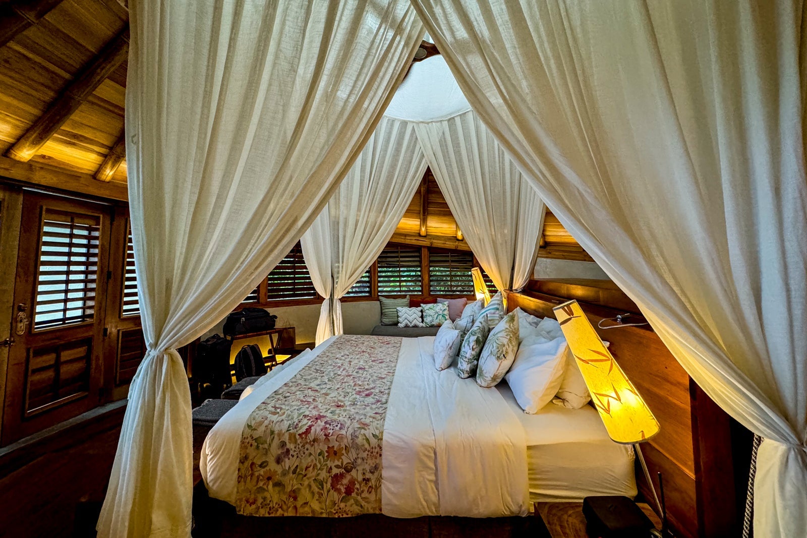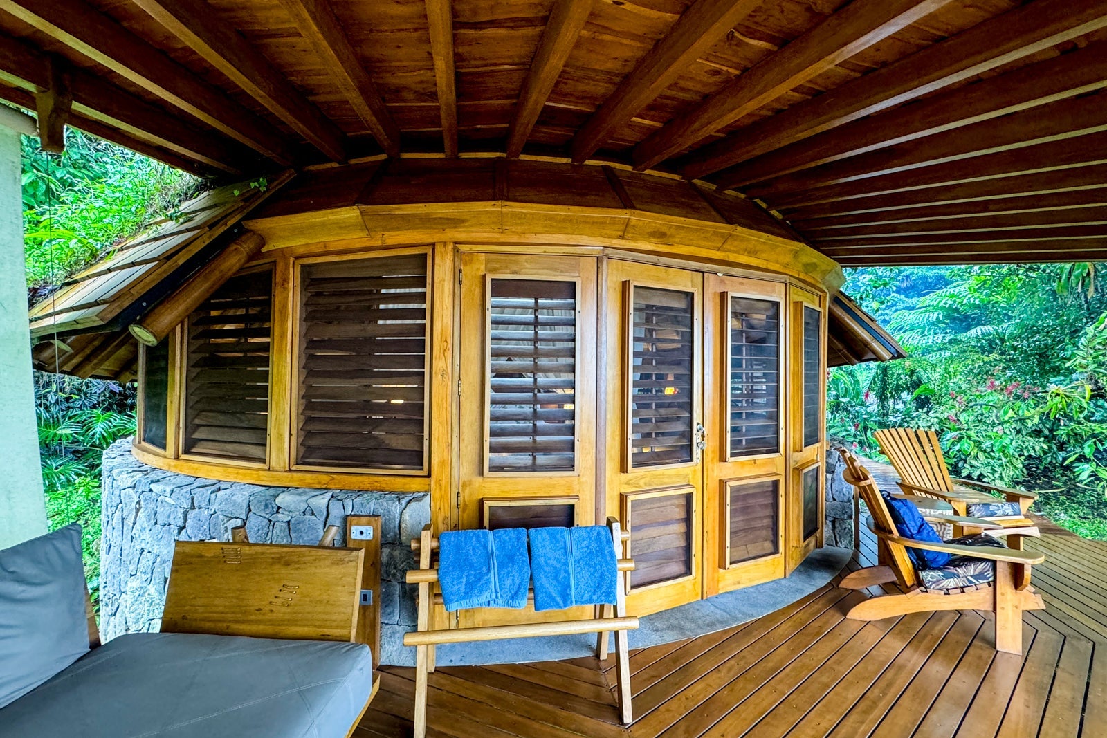 There are just six individual suites — each named after a plant, animal, insect or cloud — plus the three-bedroom Villa Vertigo for larger parties, all located a short walk or buggy ride from the main lodge. Though some are close together, they all have plenty of privacy thanks to their orientation and the 111-acre property's dense foliage.