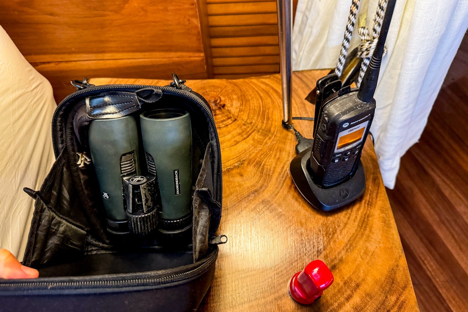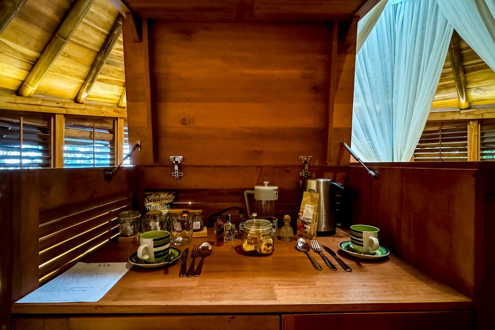 There is a minibar with tea and coffee plus other beverages and snacks (ask for some locally produced chocolate bars), and in the closets, you will find ponchos, umbrellas, handy flashlights and insect repellant, though citronella coils keep most biters at bay.