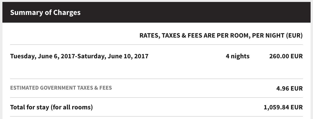 I had a pretty open schedule to work with, so after looking at various possible travel dates, I found summertime starting prices at the Paris Marriott Opera Ambassador Hotel were consistently in the mid-$300 to high-$400 range. Eventually, I was able to lock in a rate of 260 euros (~$307 at the time) per night, and used my Chase Sapphire Reserve Card so I could earn 3x points for the travel purchase. My total came to 1,059.84 euros (~$1,228 at the time) for my four-night stay, earning me 3,684 Ultimate Rewards points in the process.