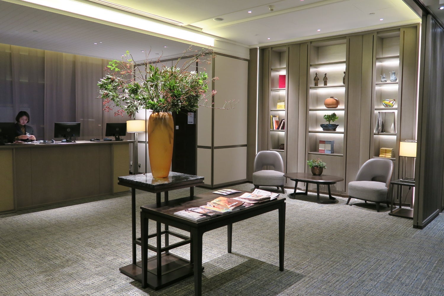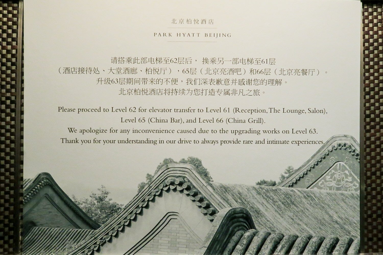 I followed signs from Exit C of Guomao station to Beijing Yintai Centre. Once in the building, I followed the signs to the Park Hyatt, which led me to an elevator to the 62nd floor and then to another elevator to the temporary reception area on the 61st floor.