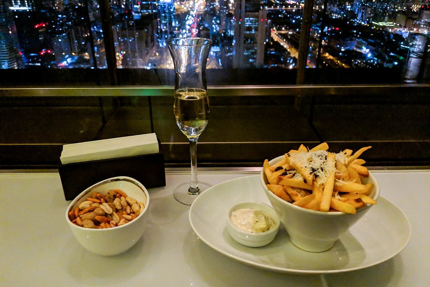 I ordered two glasses of Chinese sparkling wine and Parmesan truffle fries for 277 yuan total (about $40) and was also provided a bowl of spicy rice-cracker mix. The sparkling wine, views and service were excellent, but the fries were lukewarm and I felt the music was too loud. The bar opened daily at 5:30pm and closed at 1am during the week and at 2am on Friday and Saturday nights.