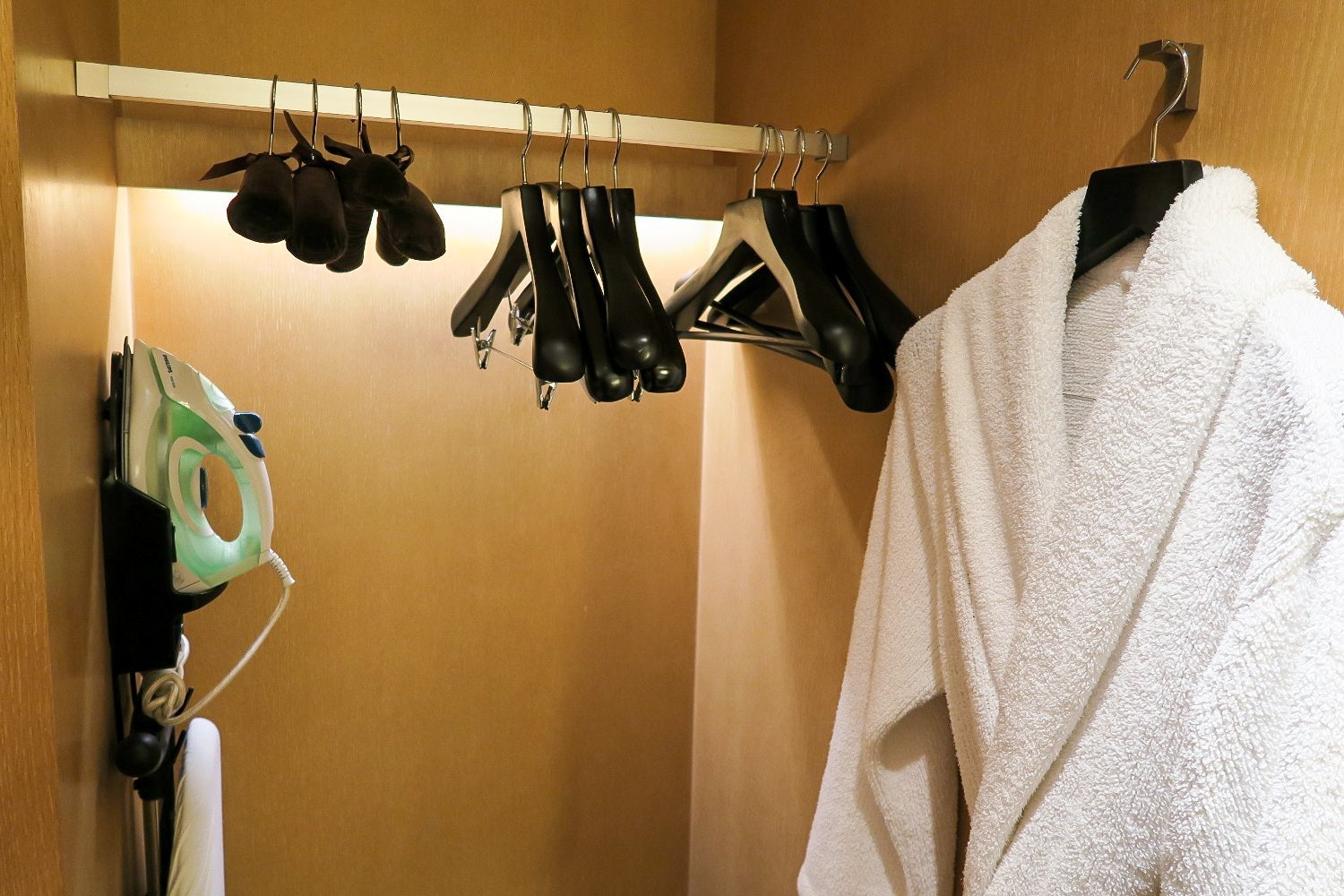 To the left of the sink and vanity was a walk-in closet with 12 hangers, an iron and ironing board and two soft, warm bathrobes.
