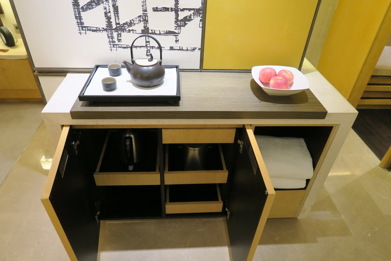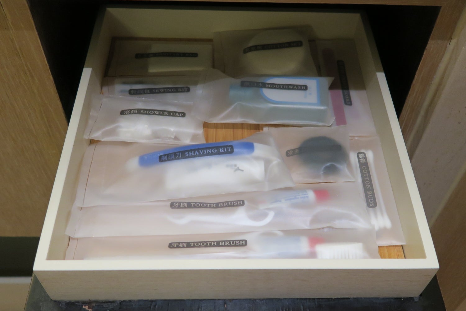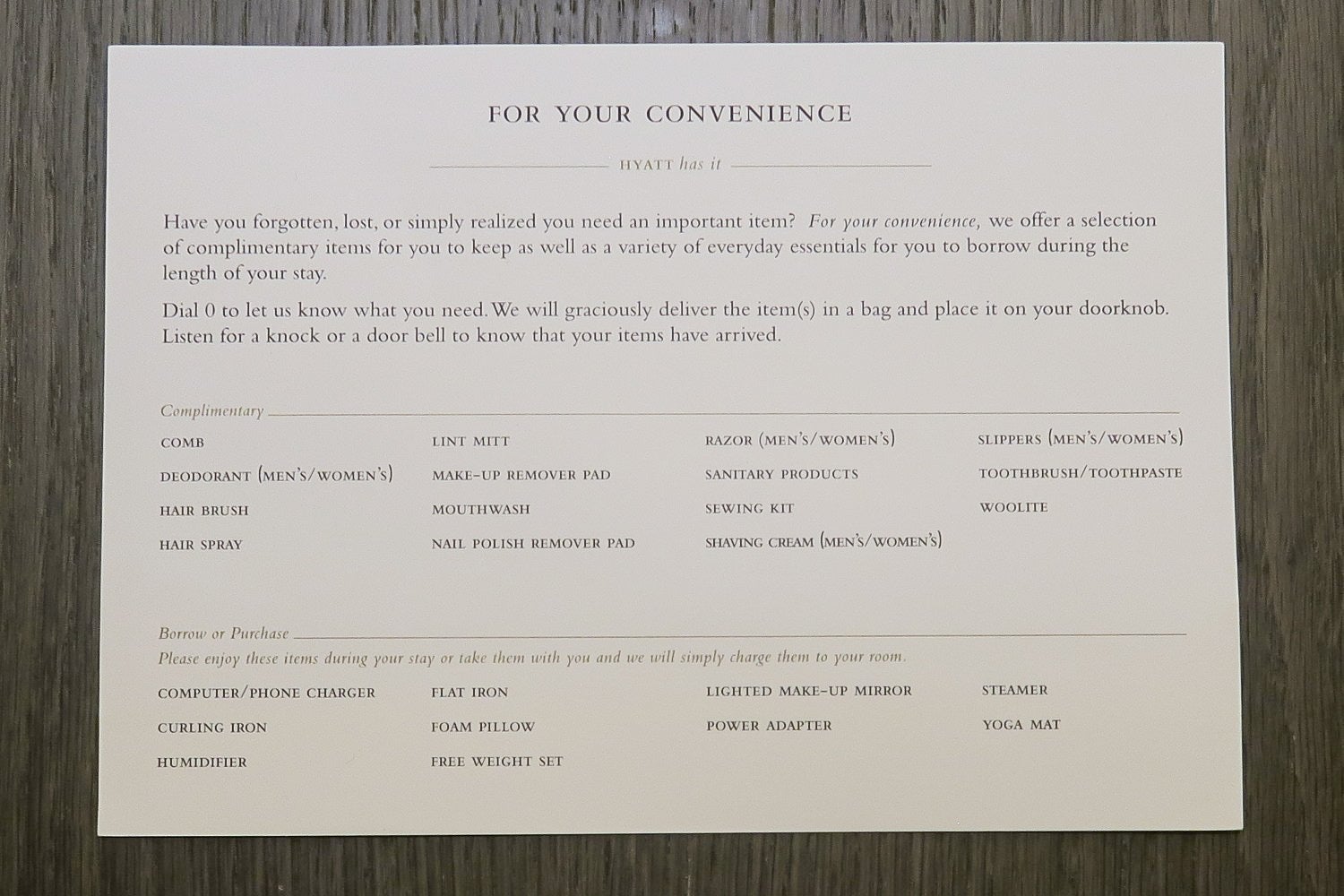 In my room, there was a pillow menu offering various types of pillows: foam pillow, cervical-support pillow, buckwheat pillow, green-tea pillow and soft feather pillow. There was also a card listing complimentary items that the hotel could provide. Some items were for you to keep, while other items were for you to borrow (or purchase, if you preferred).