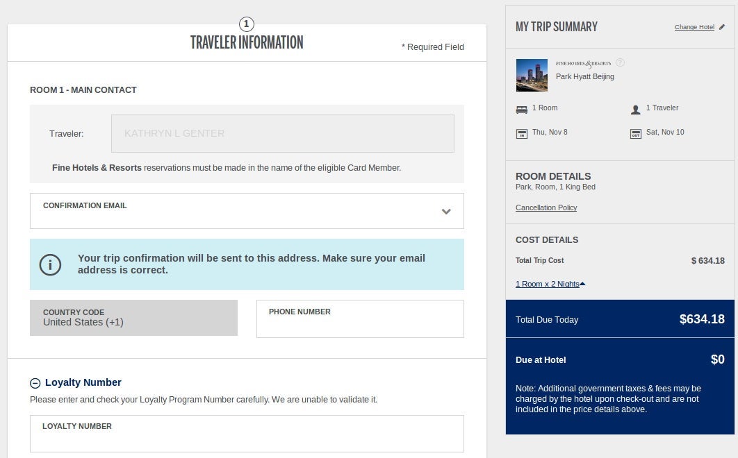 The total for two nights came out to $634. I made sure to add my Hyatt elite number to the booking.