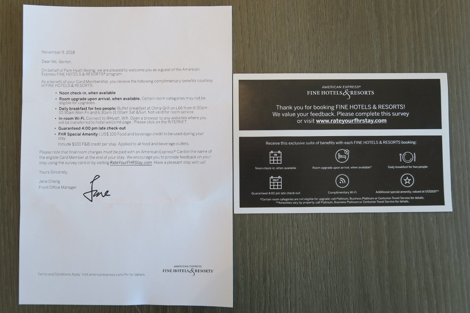 The check-in agent explained my Amex FHR benefits, although I wish I'd also received a printout, as the details were too much to remember. I ended up visiting the front desk the next morning to clarify some of the benefits and found FHR information from the hotel waiting in my room later in the day.