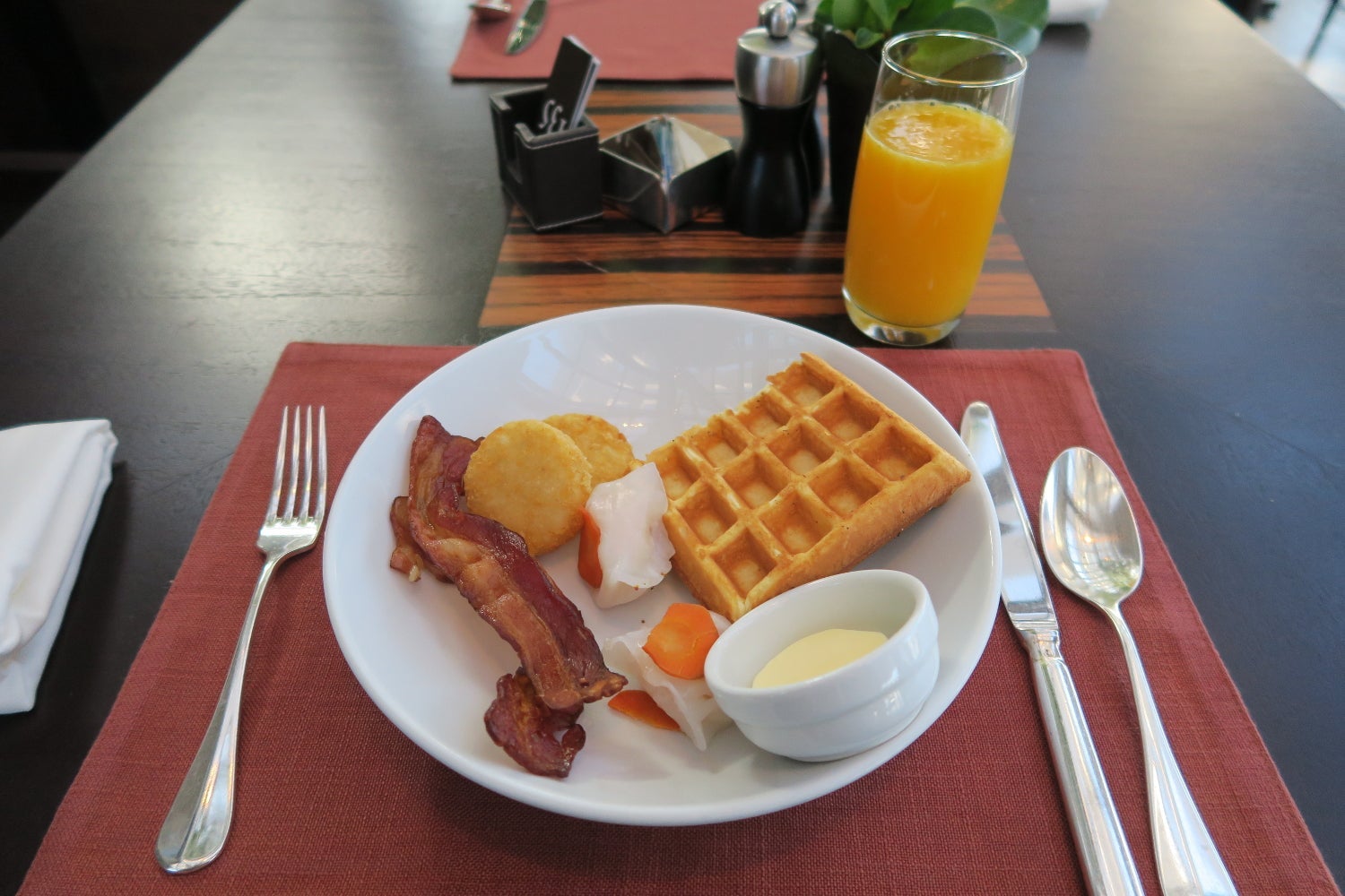 Breakfast was served daily from 6:30am to 10:30am as a buffet with a made-to-order juice station and a cooked-to-order food station. The buffet had Western and Chinese options, but the quality varied greatly. For example, the fruits were fresh and the hash browns crisp, but the waffles were tough and barely warm.