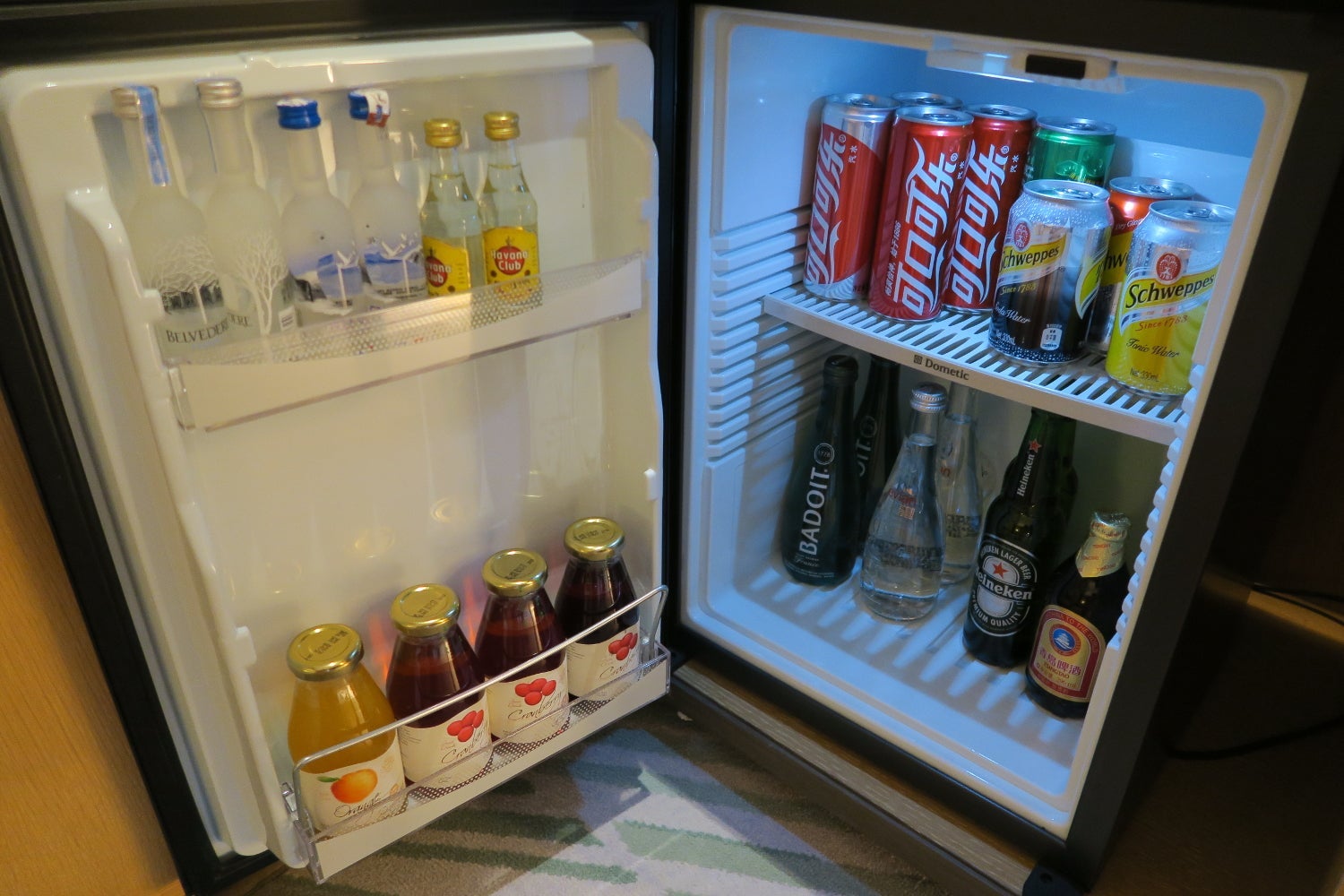 Beneath this drawer was a cabinet containing a refrigerator with cold minibar items.