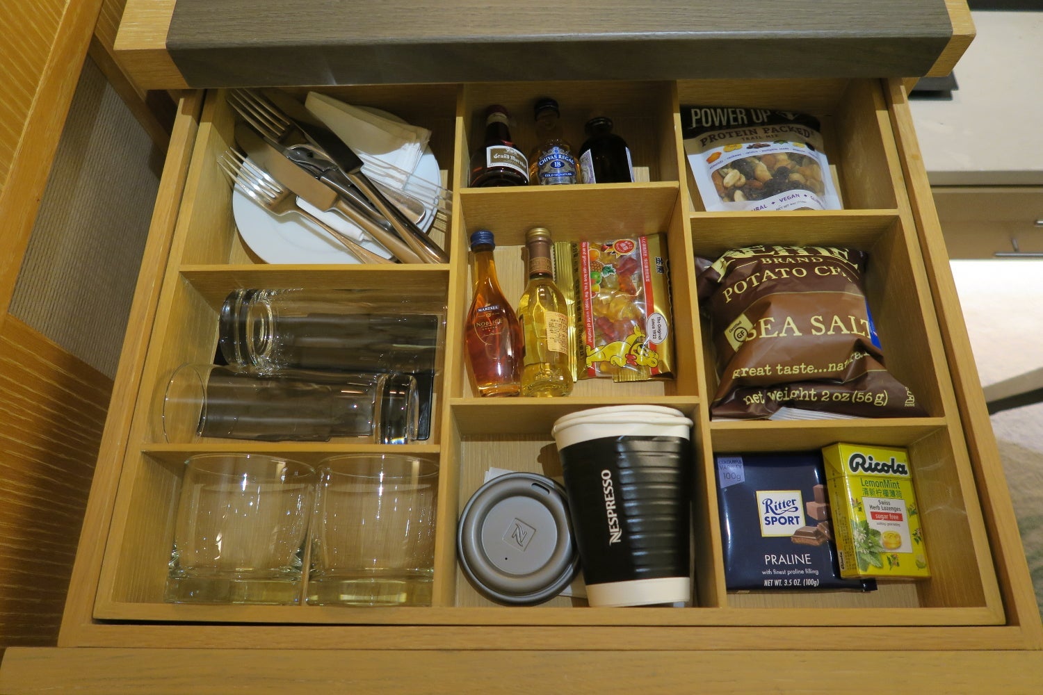 The room-temperature minibar items were in a drawer below the coffee machine.