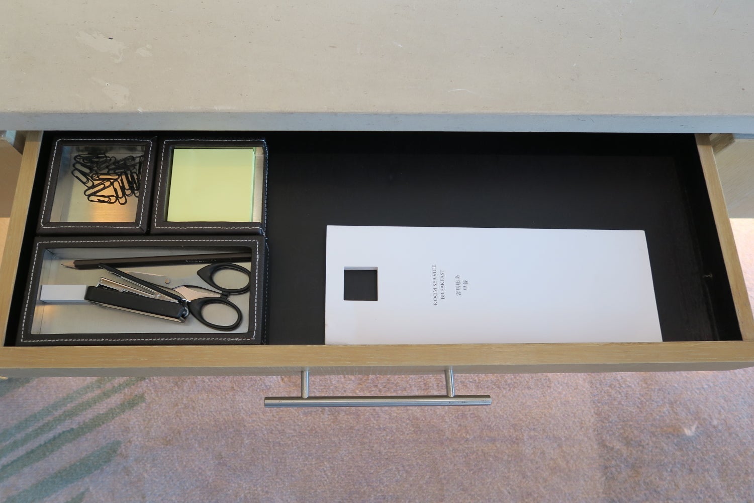 Next to the desk was a drawer with office supplies like paperclips and a stapler.