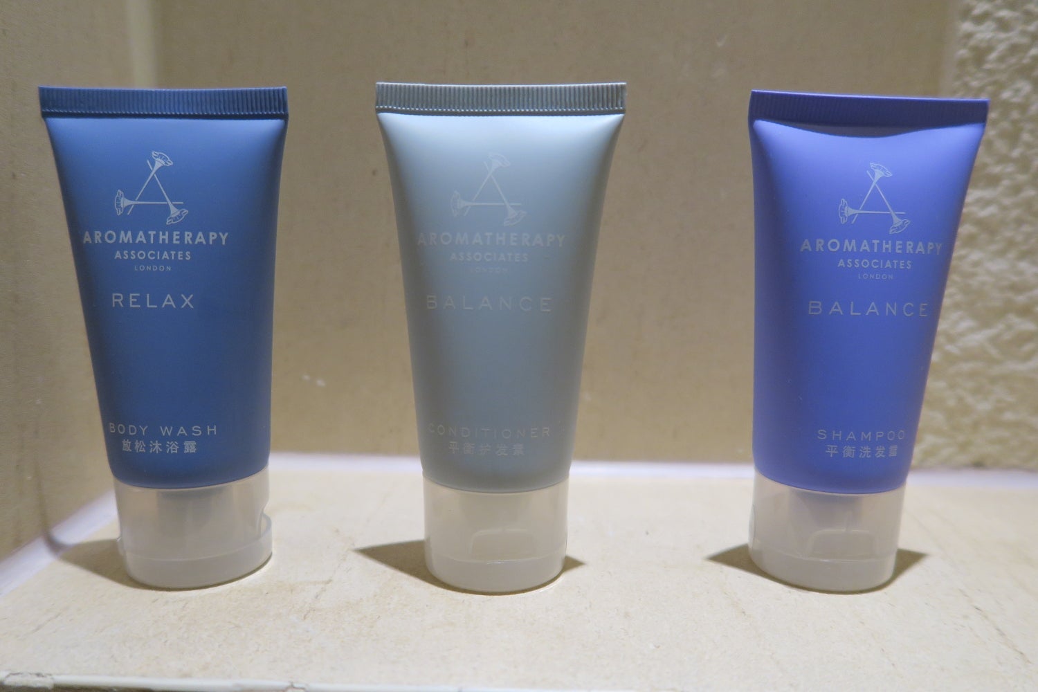 Body wash, shampoo and conditioner from Aromatherapy Associates was provided in the shower, while a bar of soap and bath crystals were by the tub.