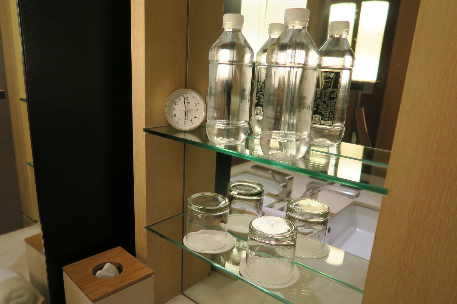 On a shelf to the right of the counter were glasses, two water bottles and a miniature clock.
