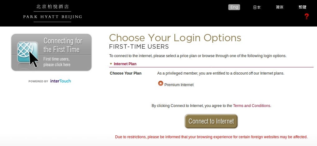 Wi-Fi was provided in guest rooms and public areas. The hotel used a Beijing-based ISP, so there were the expected issues resulting from China's Great Firewall.