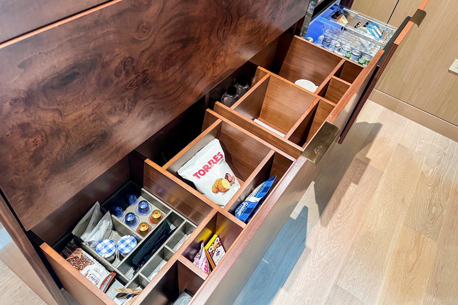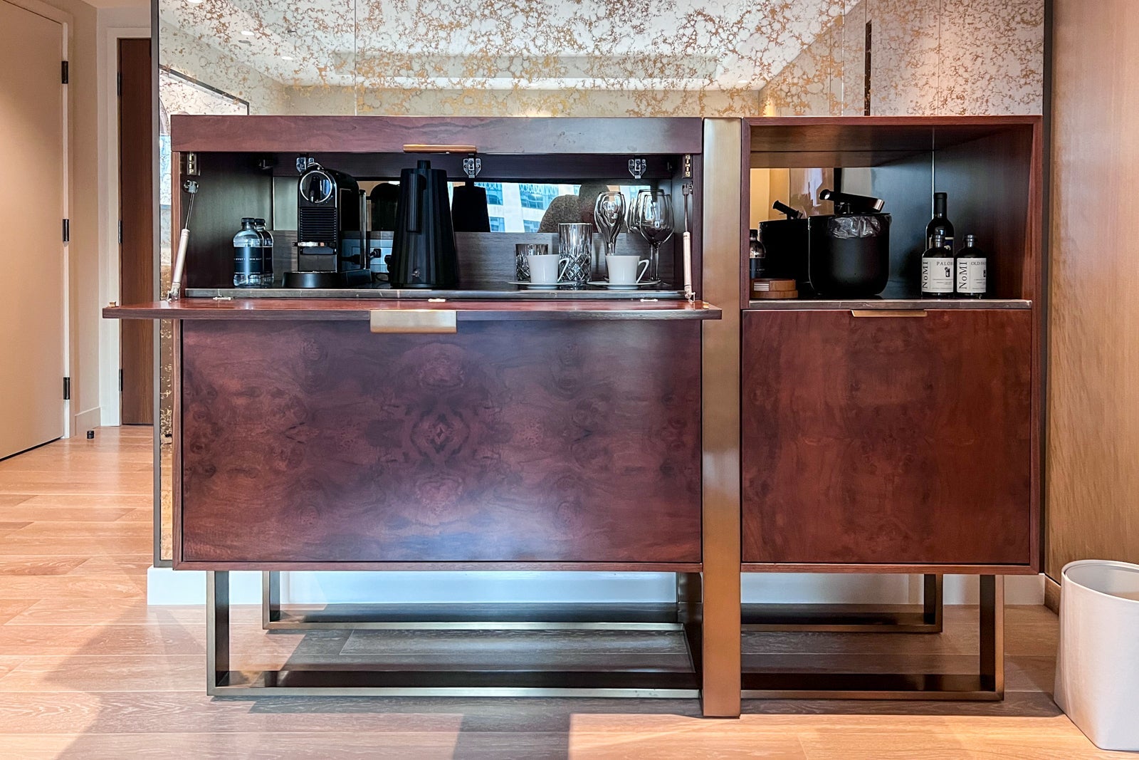 A large, wooden chest dominated one side of the living room in front of a patterned, mirrored wall. This piece of furniture housed everything from the minibar to the ice bucket, wine glasses, coffee cups and Nespresso machine without seeming too cluttered.