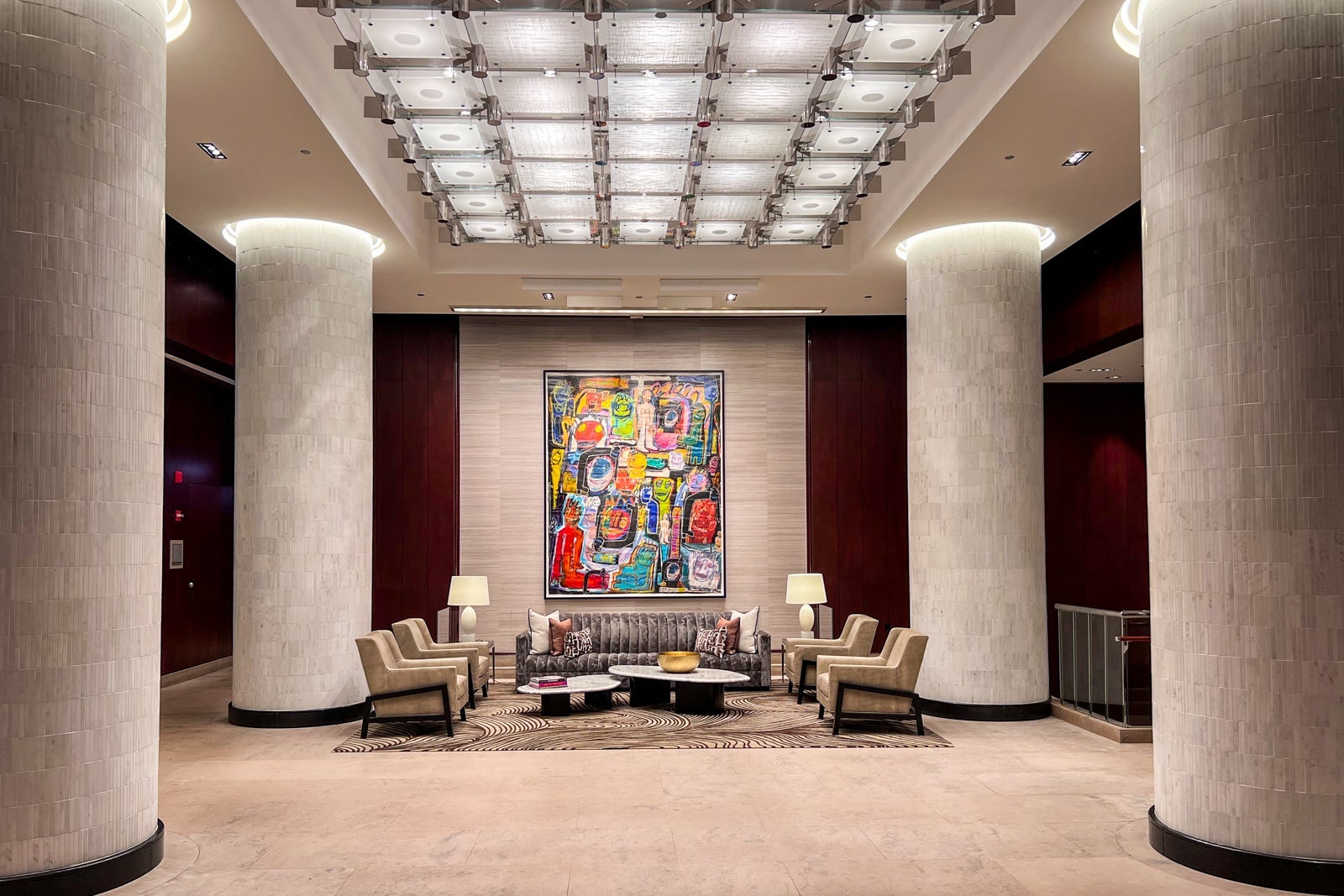 The lobby is a stunner and split into two distinct areas: a cozier, dimly lit section that feels more like a library, with cream-colored couches and built-in bookshelves; and a much more expansive, high-ceilinged area with lighter-tiled columns. Both of these spaces had the same layout prior to the renovation, but older photos of the lobby show the open-concept area was previously darker with black columns; the lighter touches today make it seem significantly larger than before.