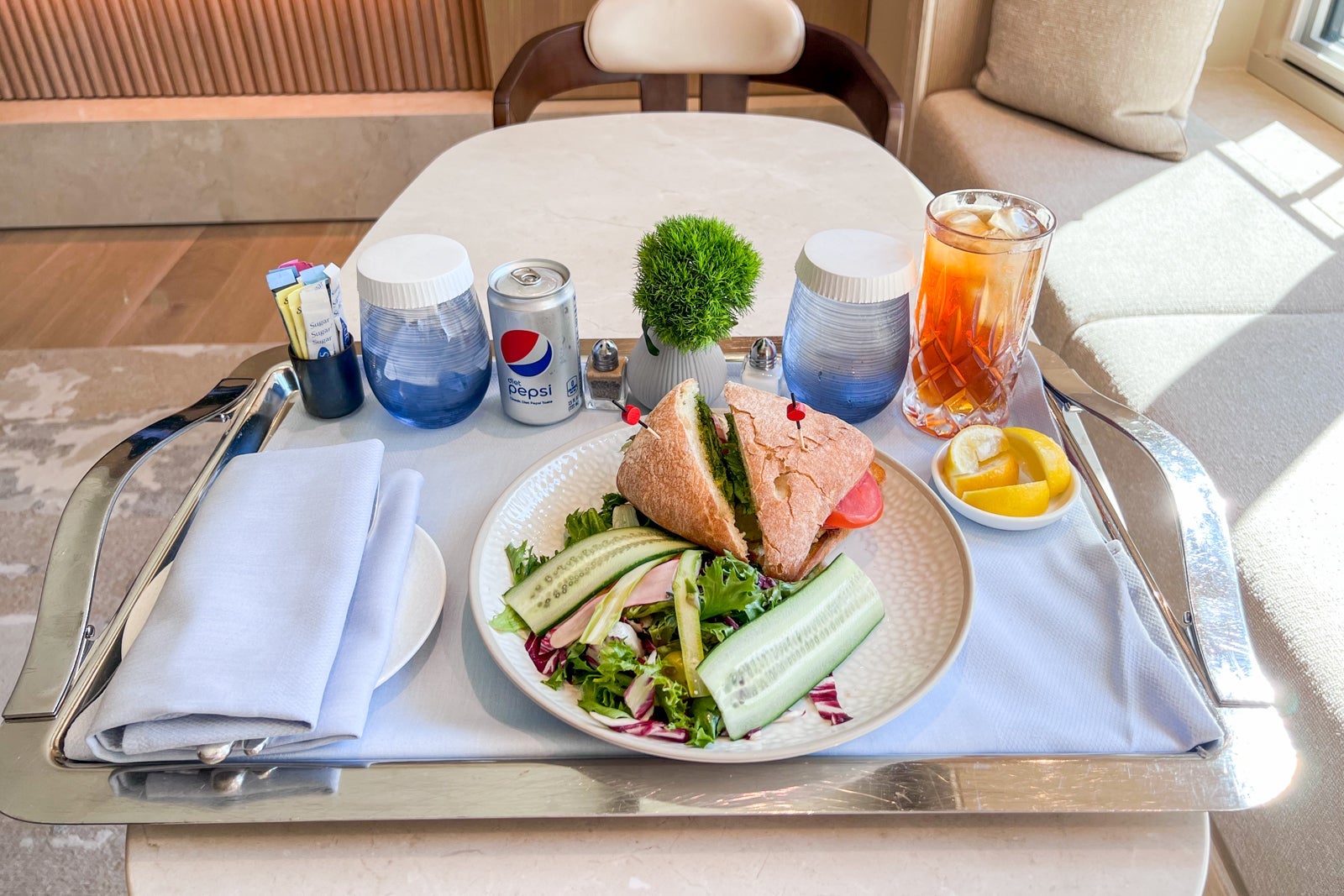 Room service was up first almost immediately after check-in as I was on deadline and famished. I ordered a pesto chicken sandwich that came with a salad for $25 along with an iced tea and a Diet Pepsi.