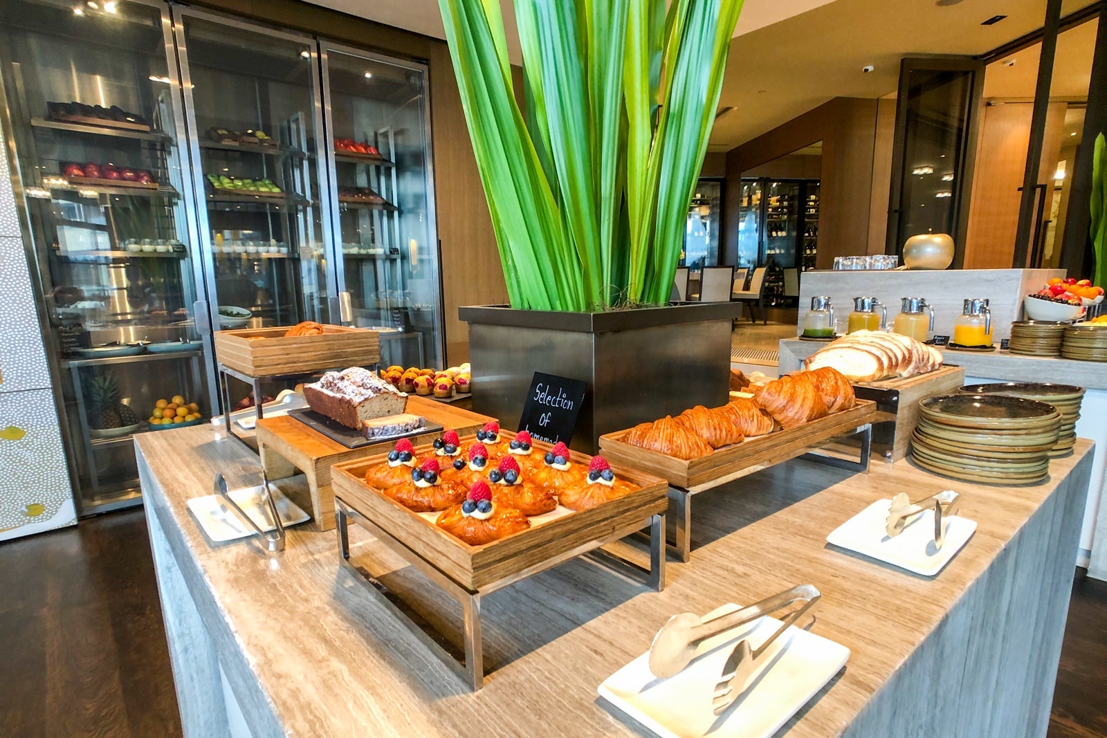 The hotel puts out a small but sumptuous spread of fresh fruits, house-baked pastries like croissants and tarts, cereal with dried fruits and yogurt, and a selection of juices including orange, pineapple and a daily special smoothie.