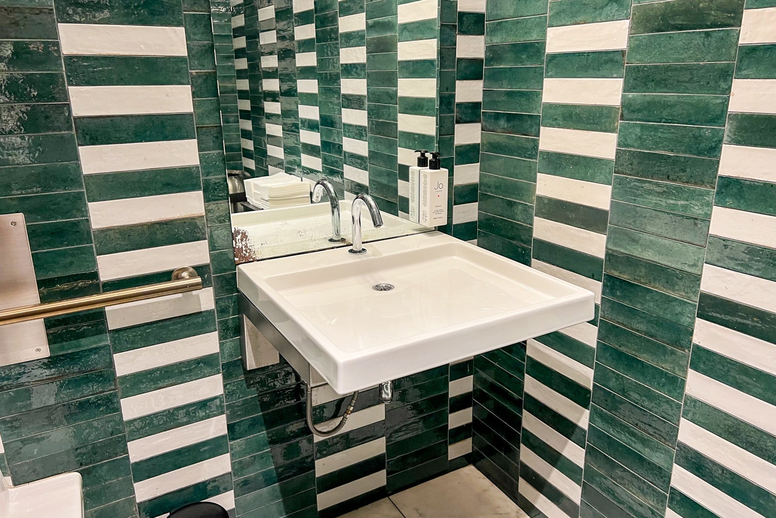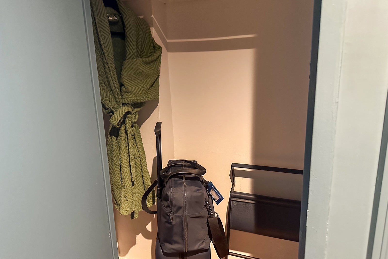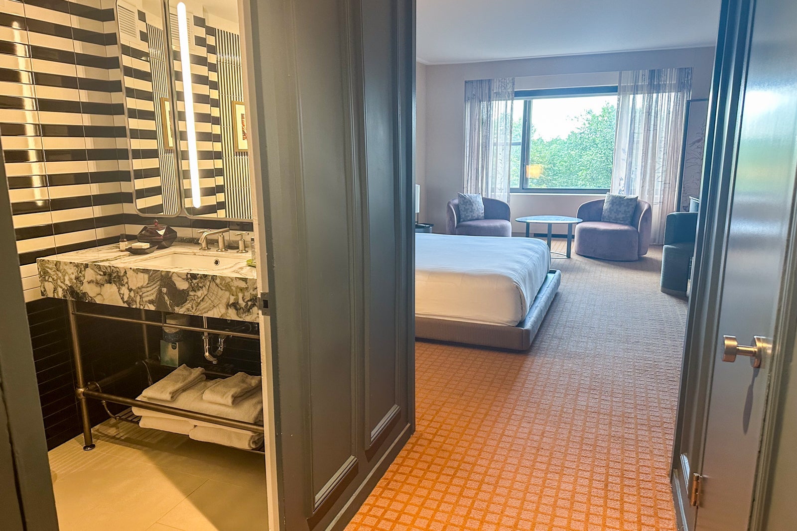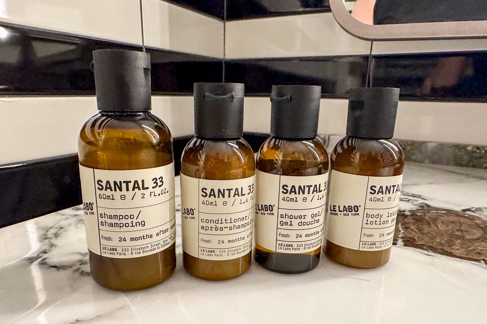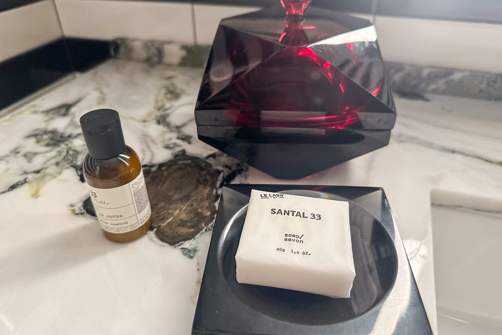 Perhaps that reference was intentional as a way to inspire guests to keep up with their skincare routine no matter how tired they may be after a full day out in the city, for which the hotel provided high-end Le Labo hair and skin products from the Hinoki line. In terms of square footage, the space was compact, but large enough to accommodate an expansive marble countertop with the sink, the toilet and a walk-in shower.