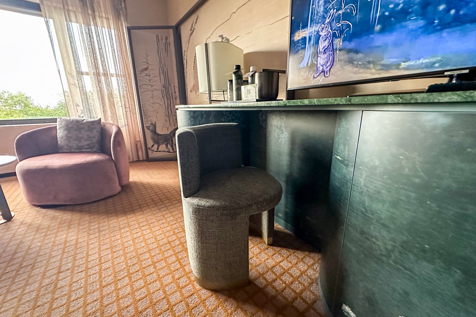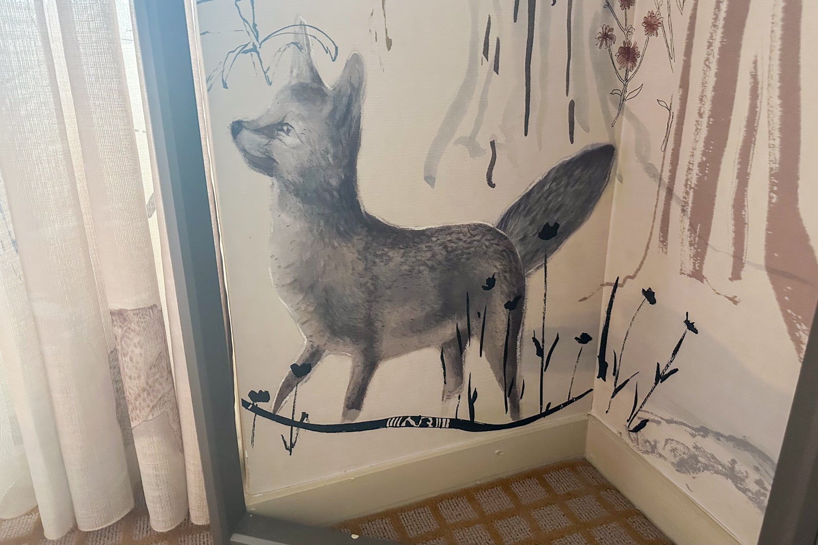 The accommodations, including my park view room (this category ranges from 350-437 square feet), extend this design aesthetic. Forest creatures like rabbits, squirrels, birds and foxes were painted in the corners of the room and on the credenza as subtle, refined references to the woodland theme.
