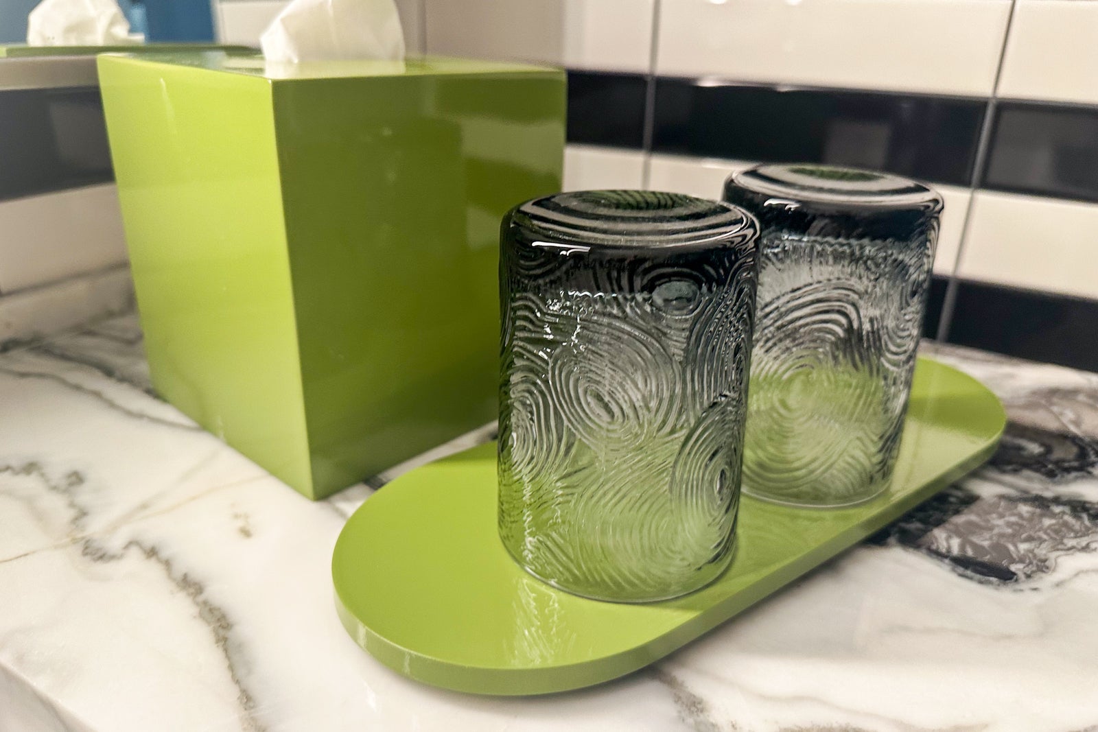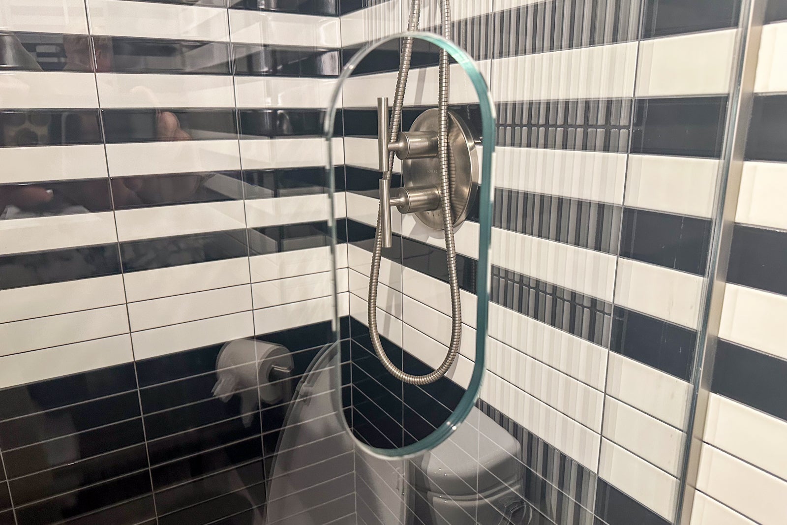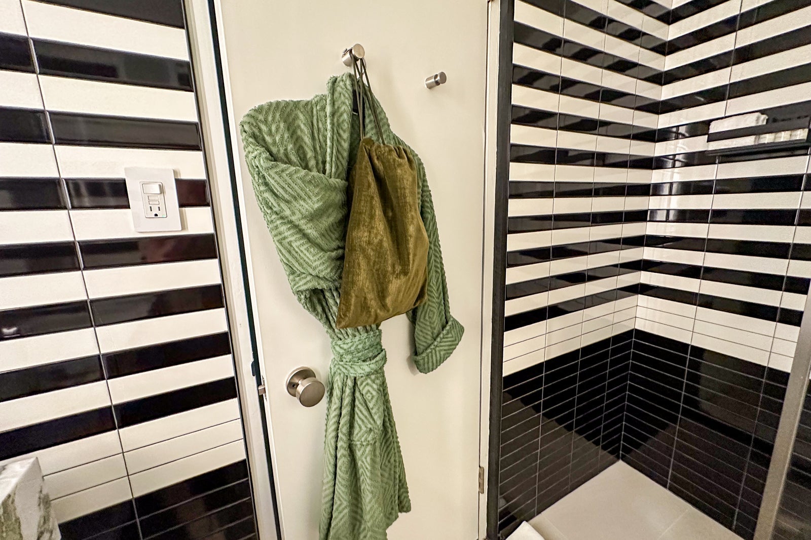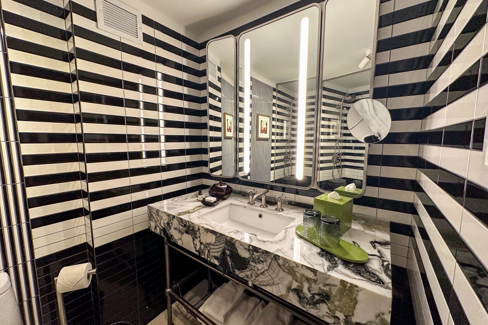 The bathroom was equally luxurious, though with a much bolder appearance. Long, skinny subway tiles in alternating black and white horizontal stripes created a classically swanky design that, interestingly enough, looked a bit like the inside of a Sephora store.