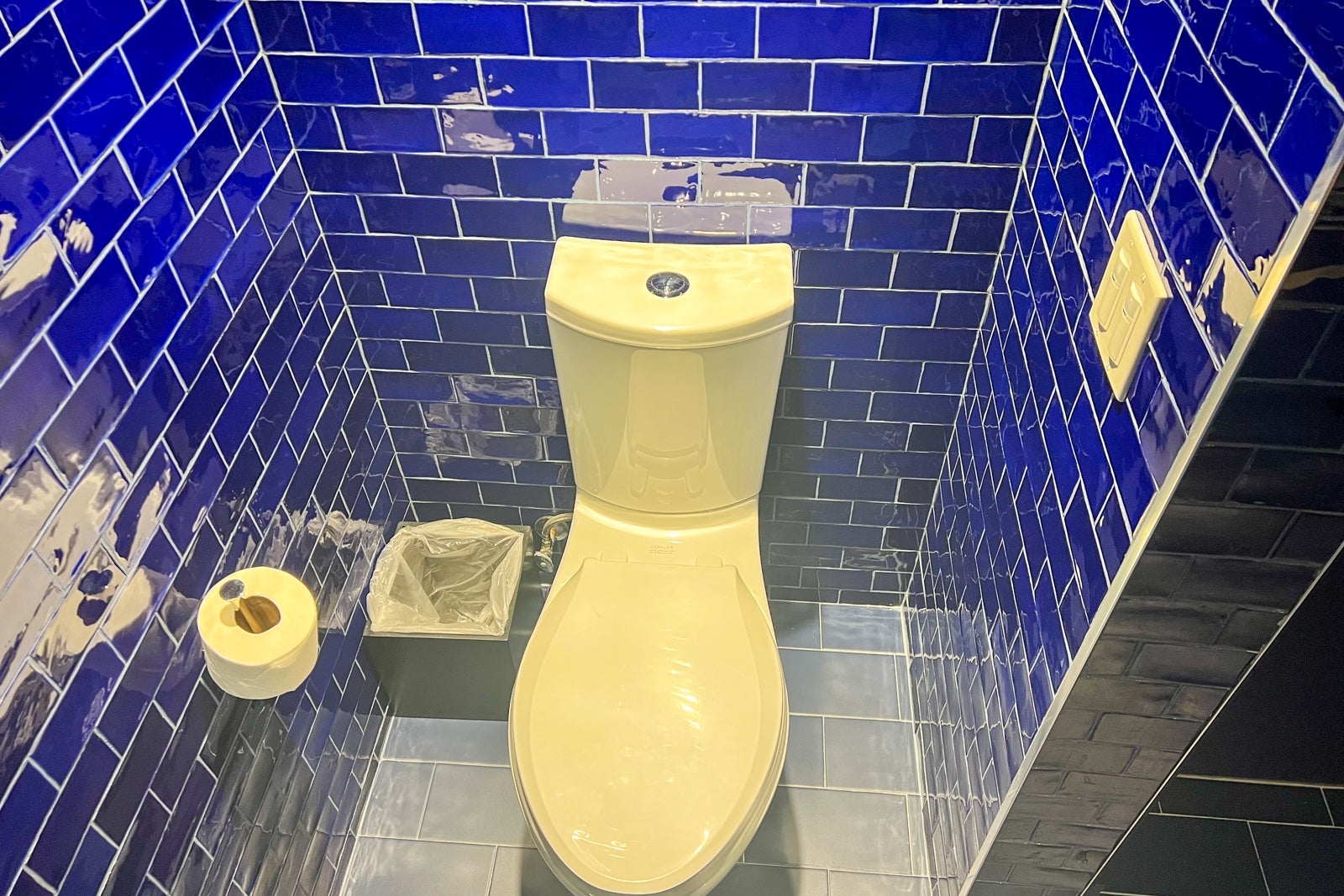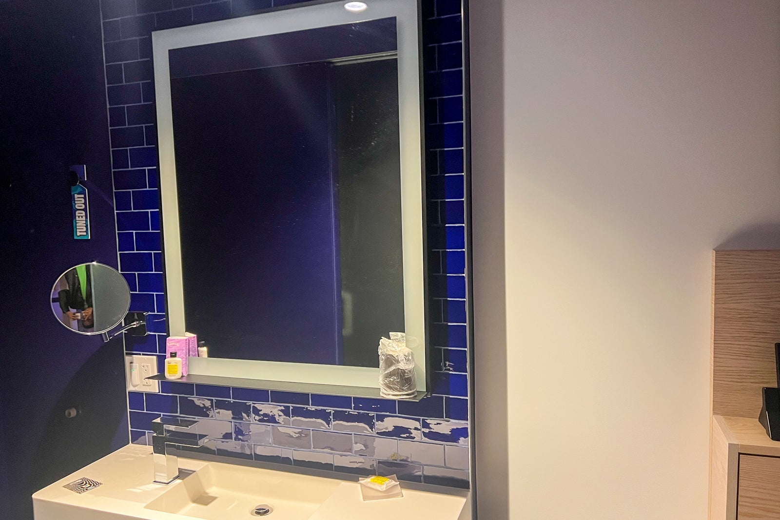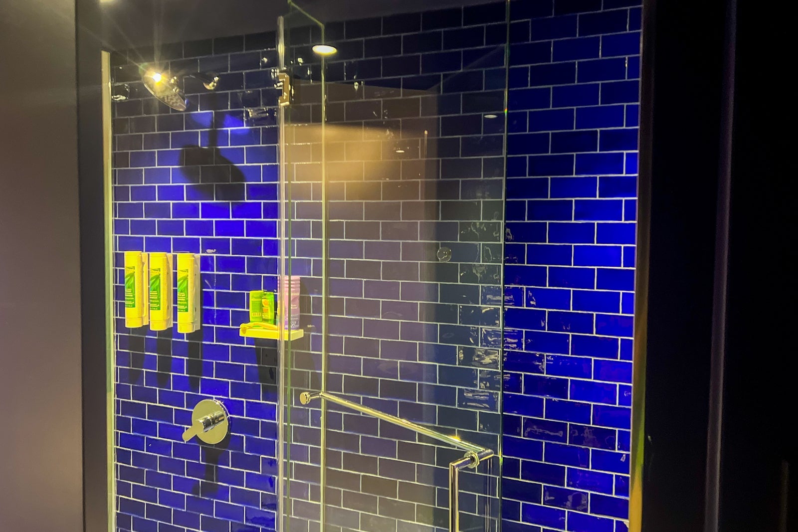 I got lost finding my room in the long, maze-like hallway, but once I finally opened the door, a motion-sensor light turned on and I was greeted with the sight of royal blue tiles on the wall.