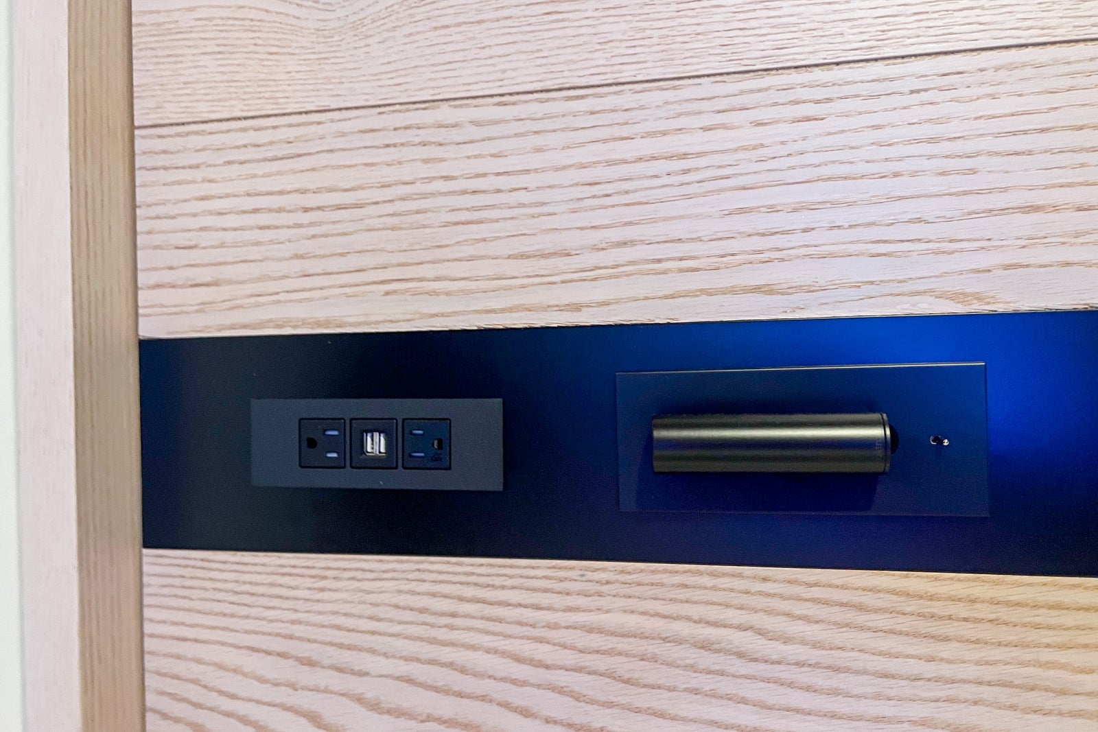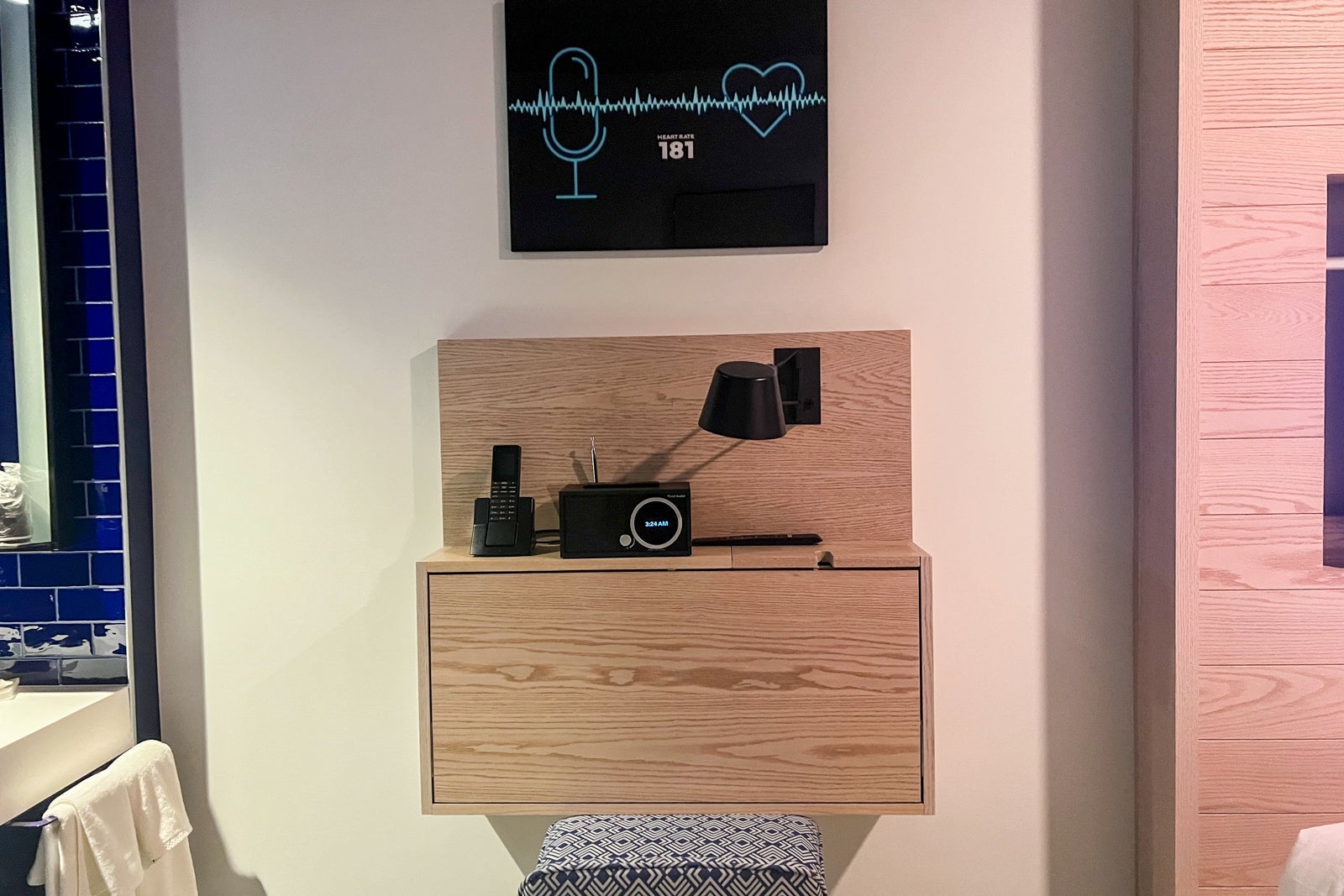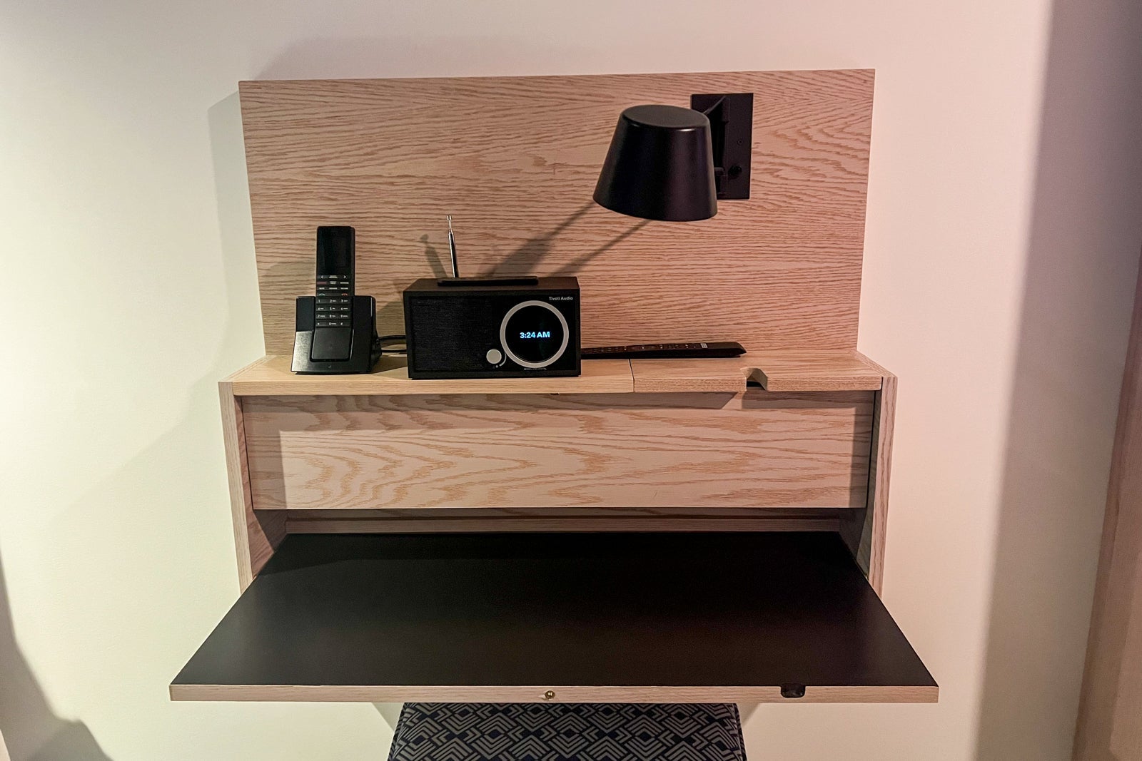 A small desk in the room was big enough for my 16-inch MacBook Pro; however, when I opened it, the space was a bit cramped. The desk chair — or stool, I should say — wasn't the most practical for doing extended amounts of work. Over time I experienced minor neck pain and, because of this, I wasn't able to do as much work in my room as I would've liked and resorted to going downstairs to the lobby.