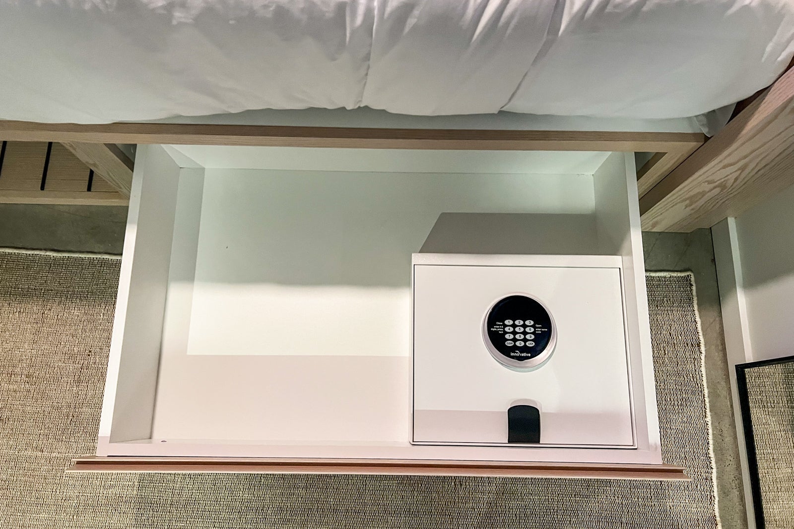 The room didn't have a typical closet or wardrobe to hang my items or store my clothes, but it did have a small rod, which came with a couple of hangers for some coats, and storage under the bed where I put my duffle bag. There was also a safe located under the bed.