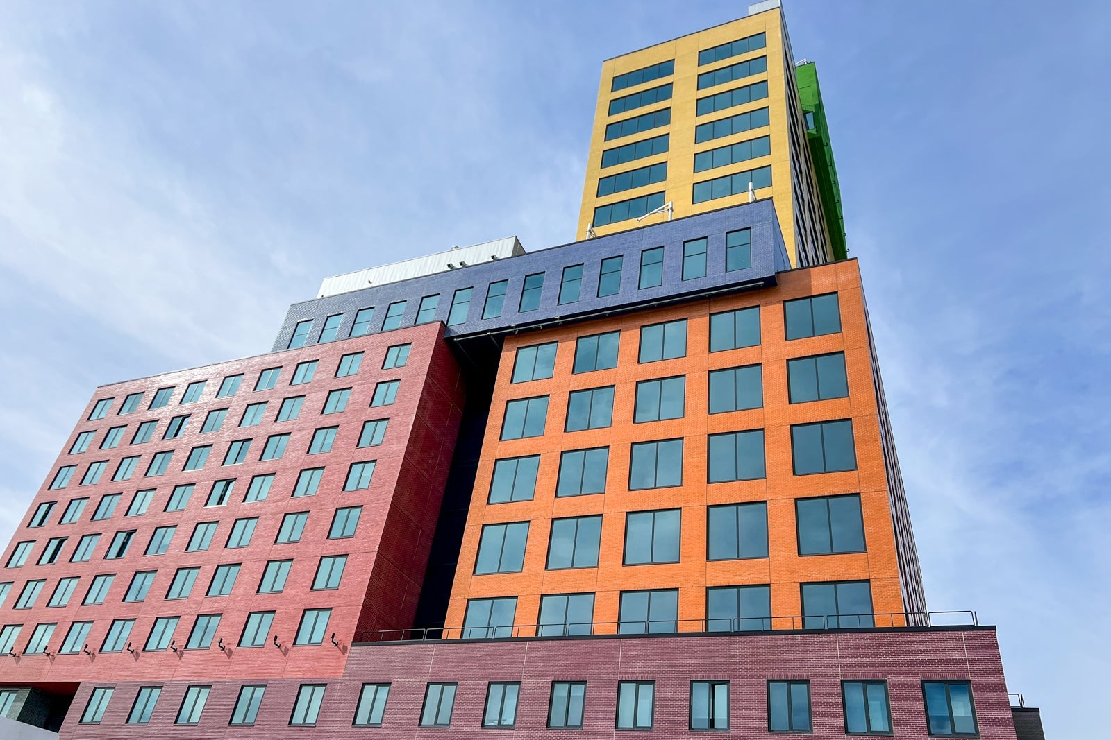 From the outside, you can't miss it. Looking like a stack of multicolored Legos, the exterior was modern and utilitarian, but with a colorful twist.