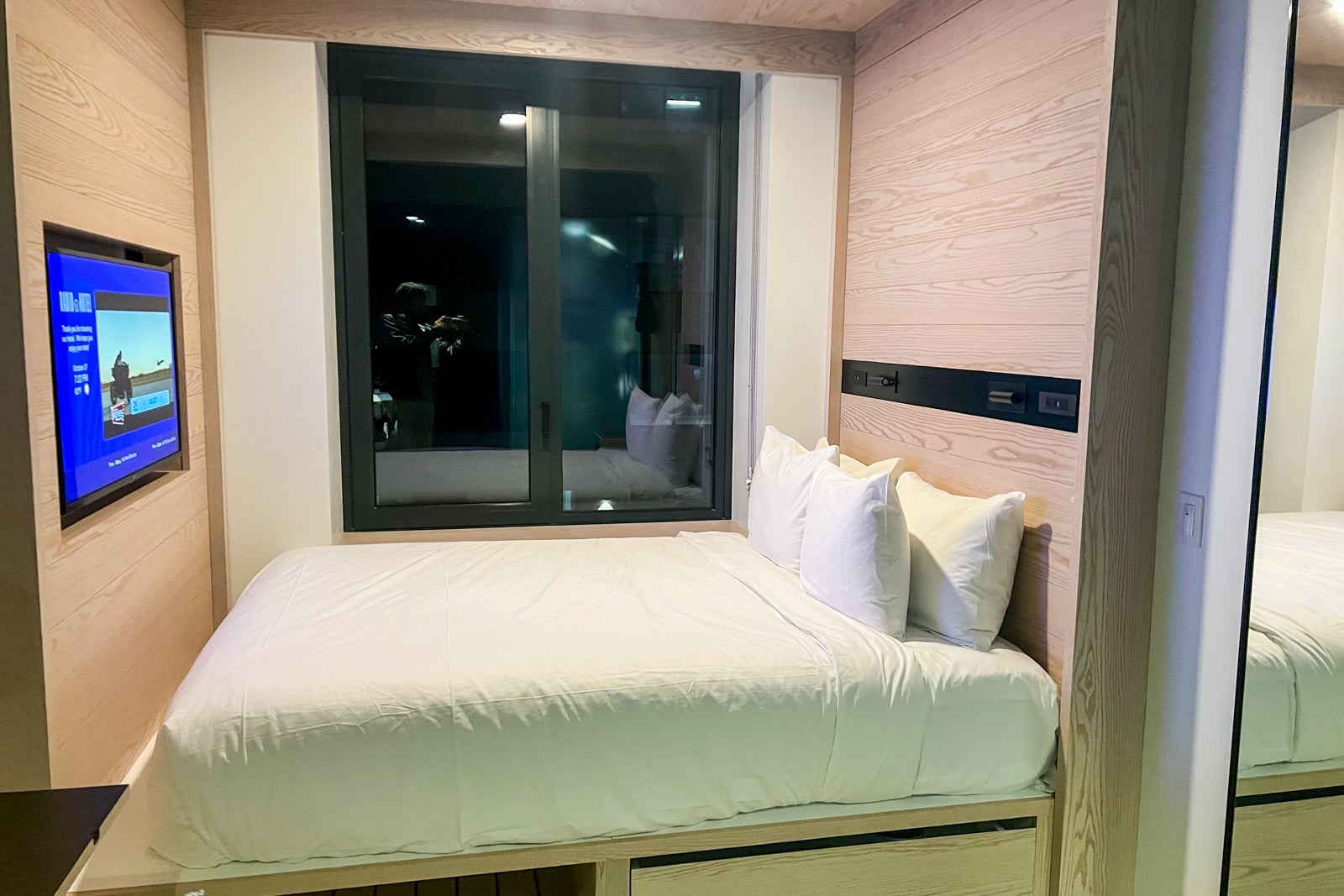 Right in the center of the room, the bed was placed on top of a wooden, canopy-like frame, nestled by the window. The TV was located within the bed frame, which made it ideal for a late-night TV binge.