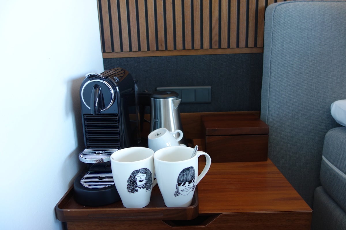 To either side were wooden nightstands and panels with European outlets and USB ports. One held a Nespresso coffee machine and a box with coffee, tea and sugar.