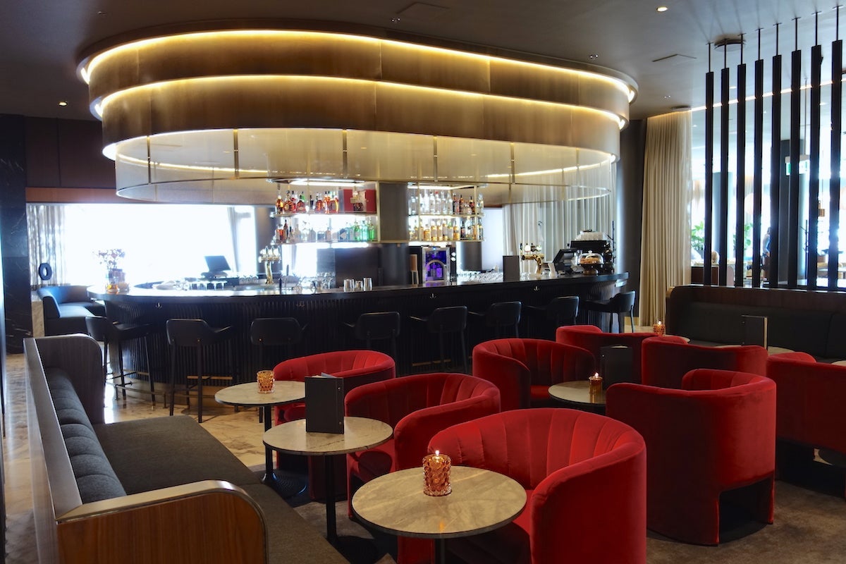 The hotel's bar and restaurant were directly off the lobby, and felt both swanky and sophisticated. The bar itself had a beautiful, tiered, lit overhang, while the rest of the area was furnished with Space Copenhagen's red velvet Loafer chairs, gray banquettes and booths and even a fireplace.