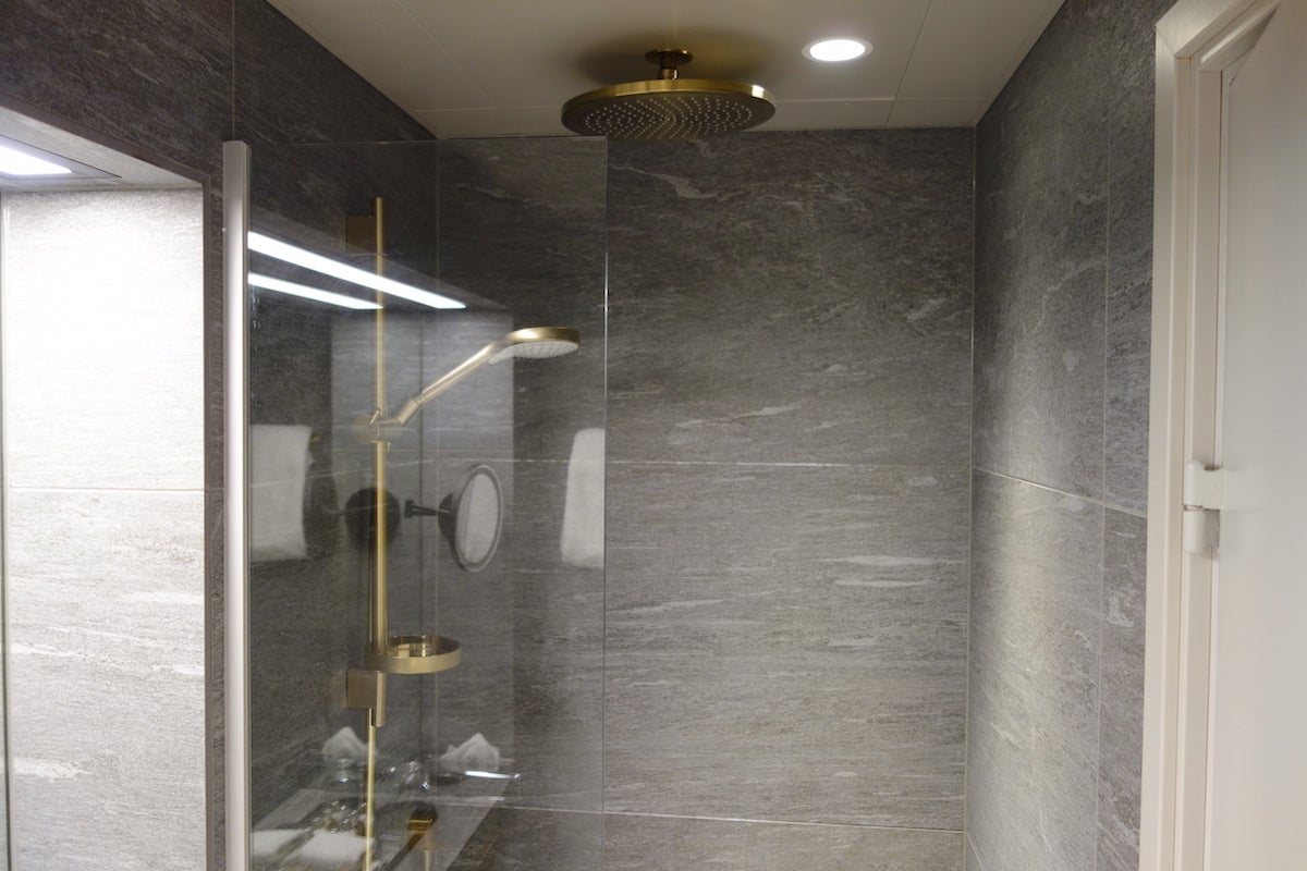 The shower had beautiful brass fittings and both handheld and overhead shower heads.