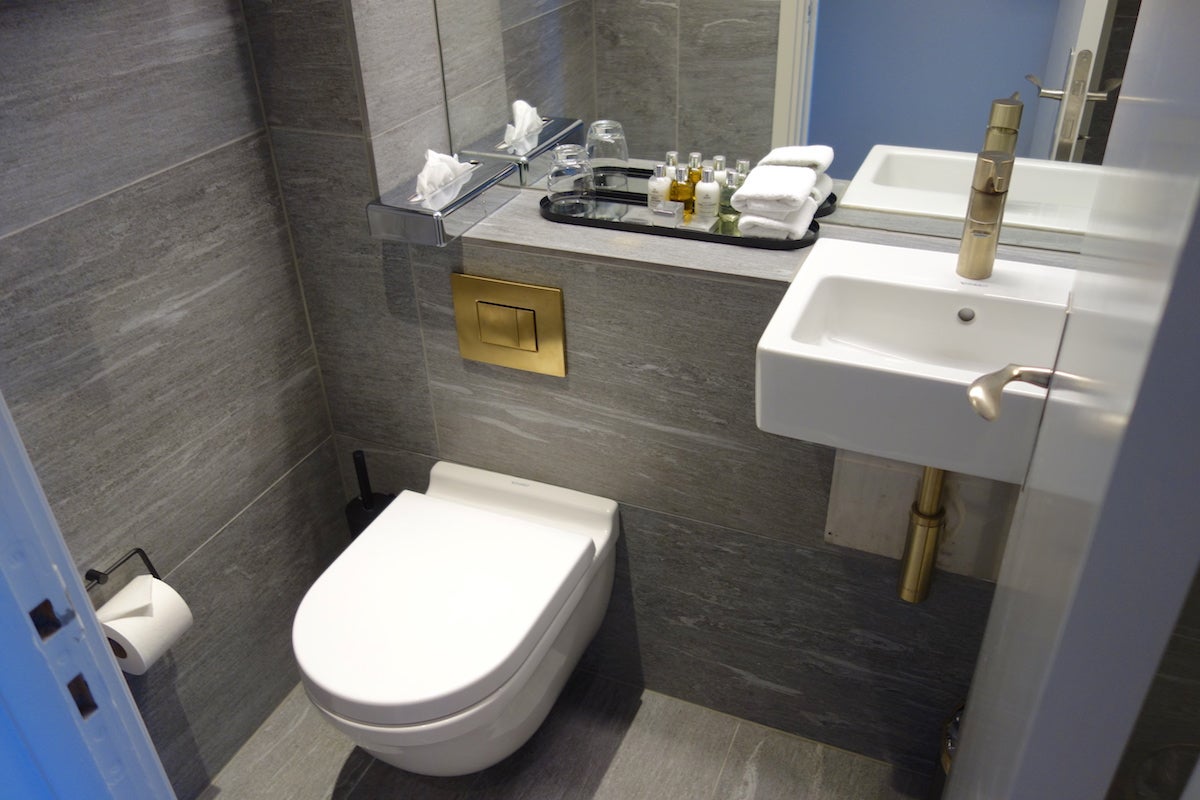 Across from it was the equally minuscule bathroom, though I did like the gray marble walls and flooring.