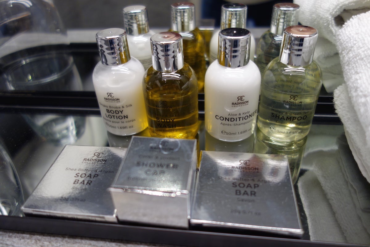 There was a single sink and shelf containing amenities like a shower cap and Radisson Collection bath amenities such as berry-sea salt body wash and aloe-kelp conditioner.