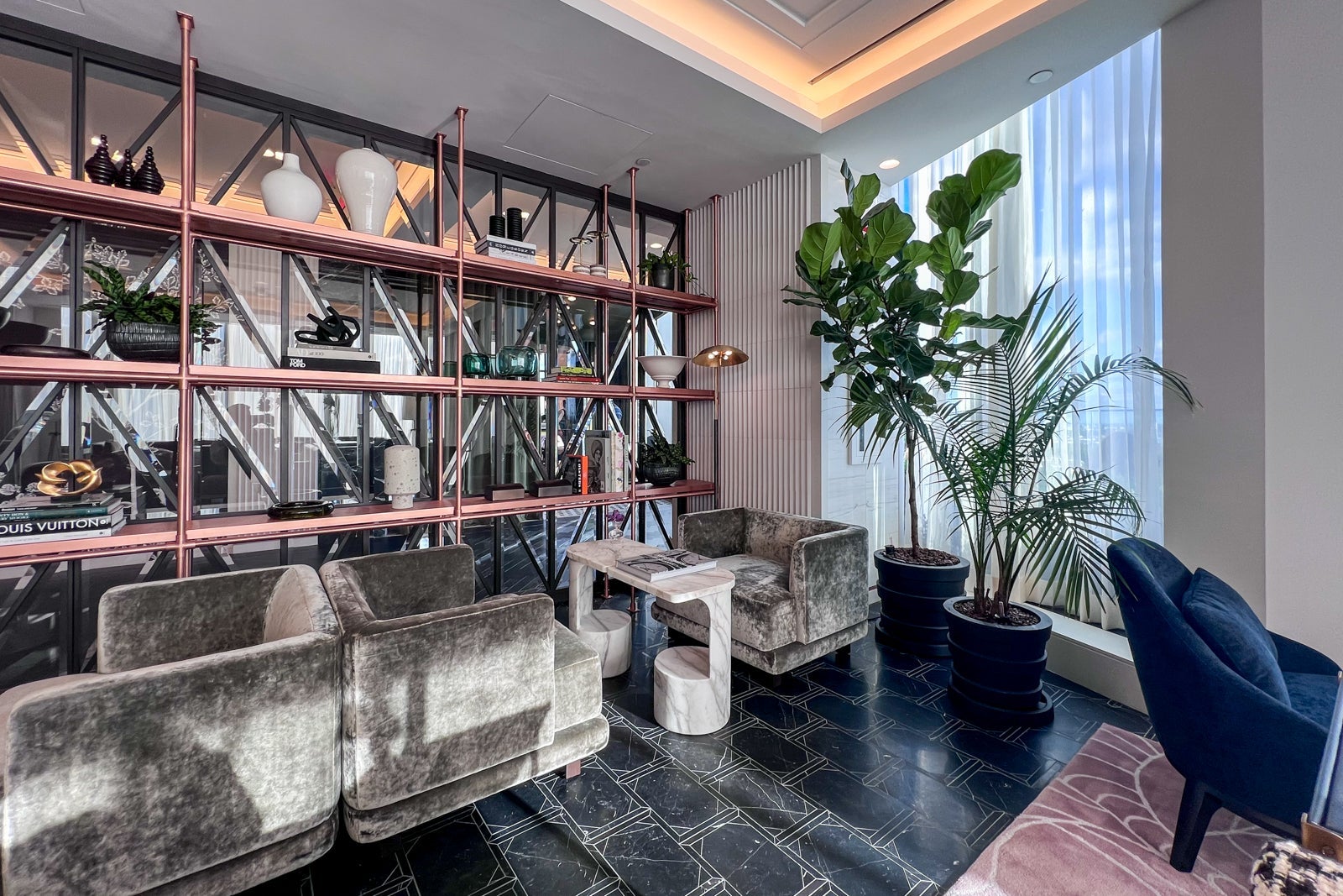 Checking into Raffles Boston is more like what you'd expect from a high-end vacation resort than a city hotel. If the skyline views don't do it for you, there's a sweeping staircase winding around a cluster of orchids directly in front of the elevators arriving from the ground level. Rather than walking up to a check-in desk, a team member greets you at the elevator once you arrive on the 17th floor and walks you to the Writer's Lounge (a small seating area to the side of the sky lobby) to handle all the paperwork and check-in.