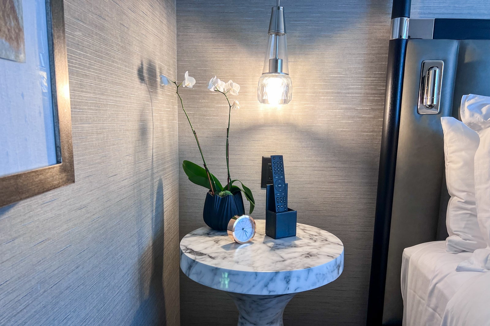 The king-size bed was cozy and featured one nightstand with the safe built into a sliding drawer, plus another nightstand with a more ornate marble look and fresh-cut orchids.
