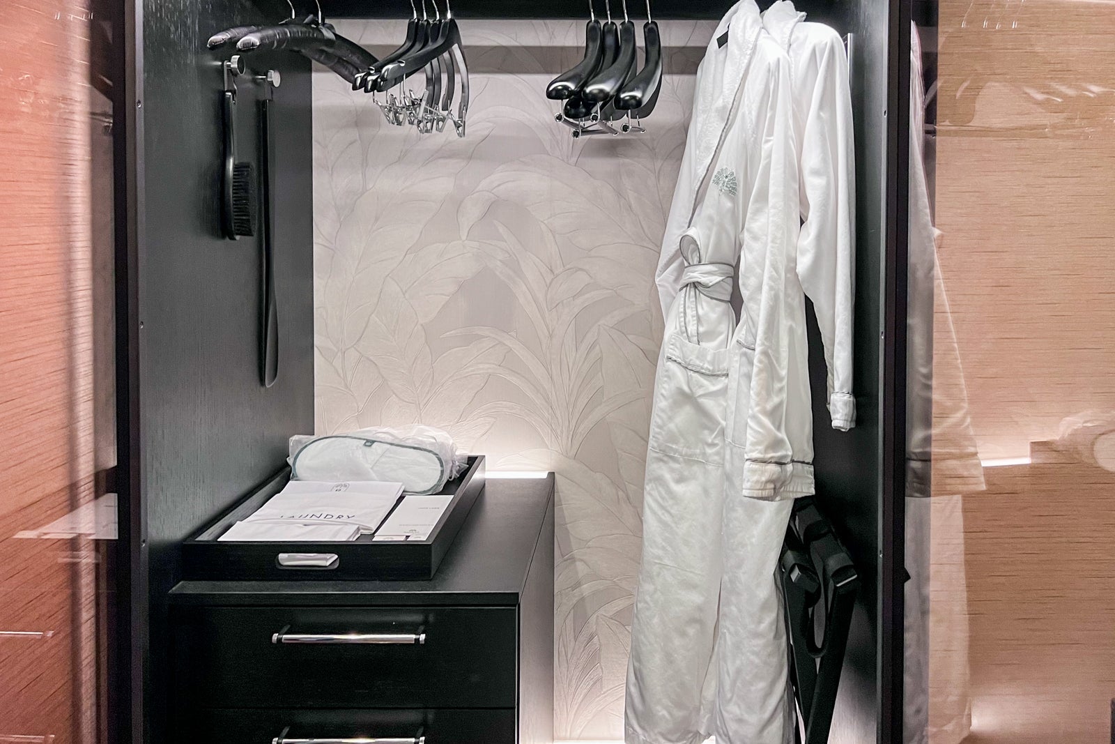 High-end details abounded in the spacious 450-square-foot Premier guest room. There were freshly cut orchids in the bathroom, on the nightstand and on the table in the seating area. The glass-doored closet lit up when opened and featured ample storage, as well as bathrobes that were moved into the bathroom by housekeeping during evening turndown service.