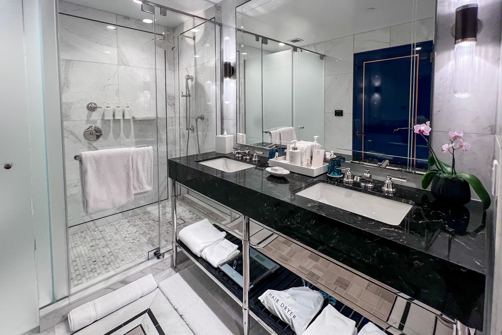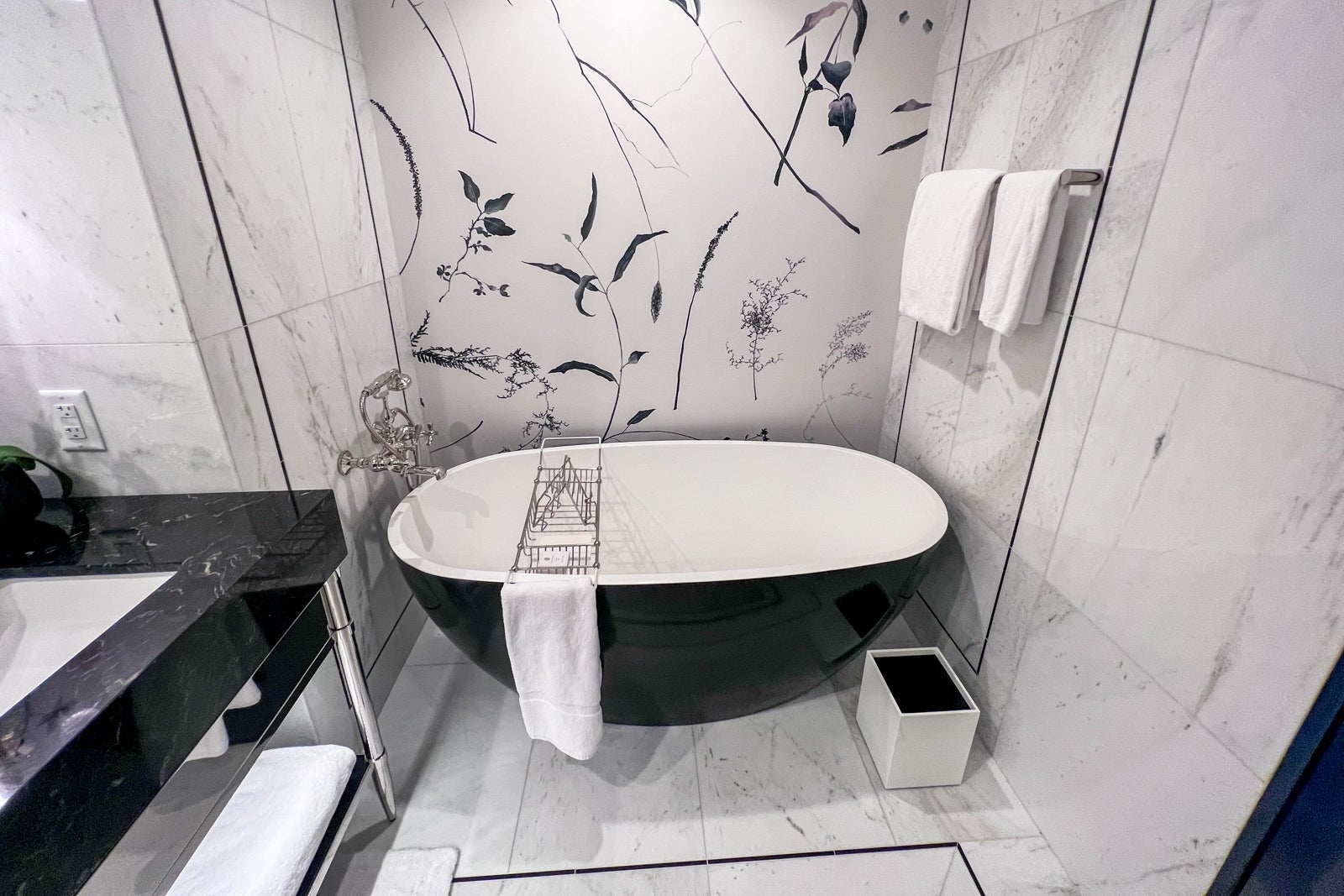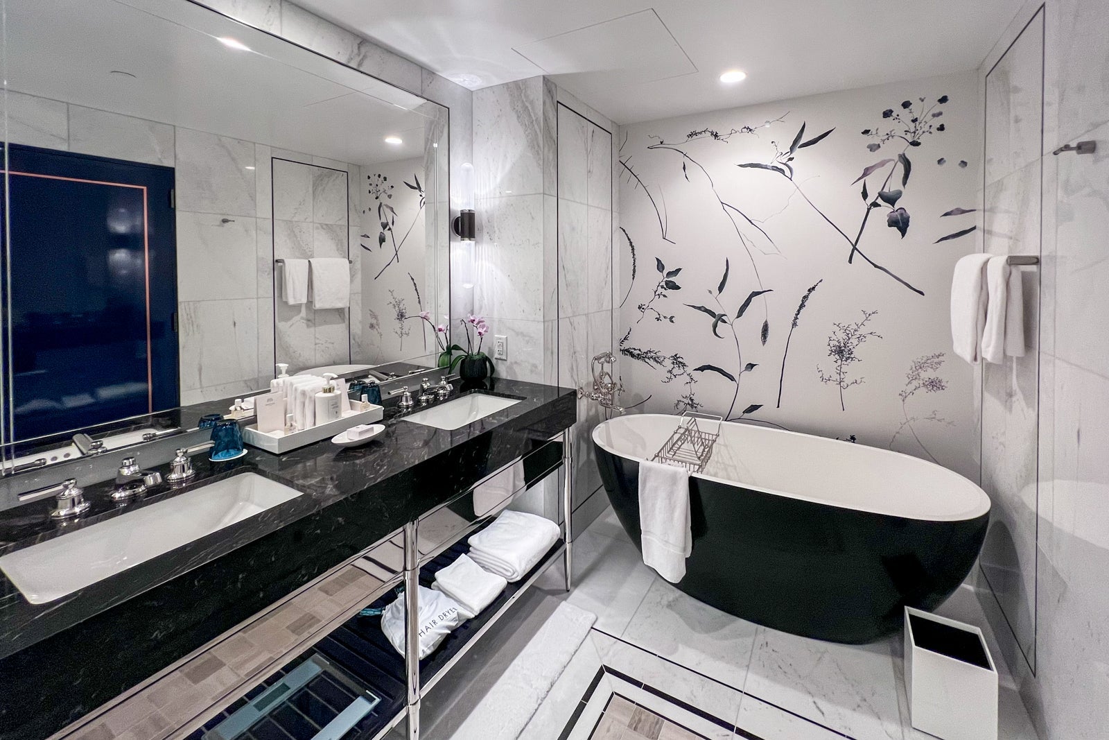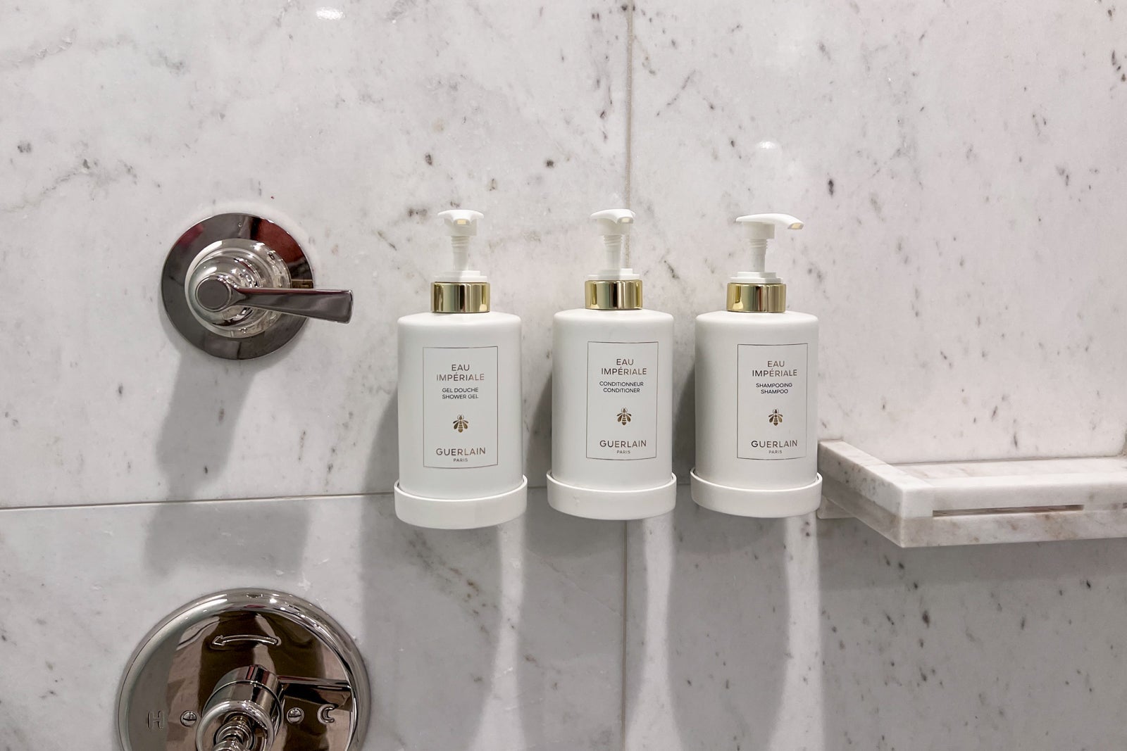 The marble bathroom was a tranquil space to freshen up, with a soaking tub complete with floral-themed backsplash, a walk-in rain shower, dual vanities and Guerlain products. The tub included a loofah glove and a nozzle for rinsing off, while the vanity was stocked with necessities like mouthwash, washcloths, Guerlain body lotion, a sewing kit and a shower cap. It's a small detail, but the large bath towels were a plus, and I wish more hotels would provide these. A fresh orchid on the vanity as well as the floral accent wall were additional signals of the extra design detail that went into this hotel.