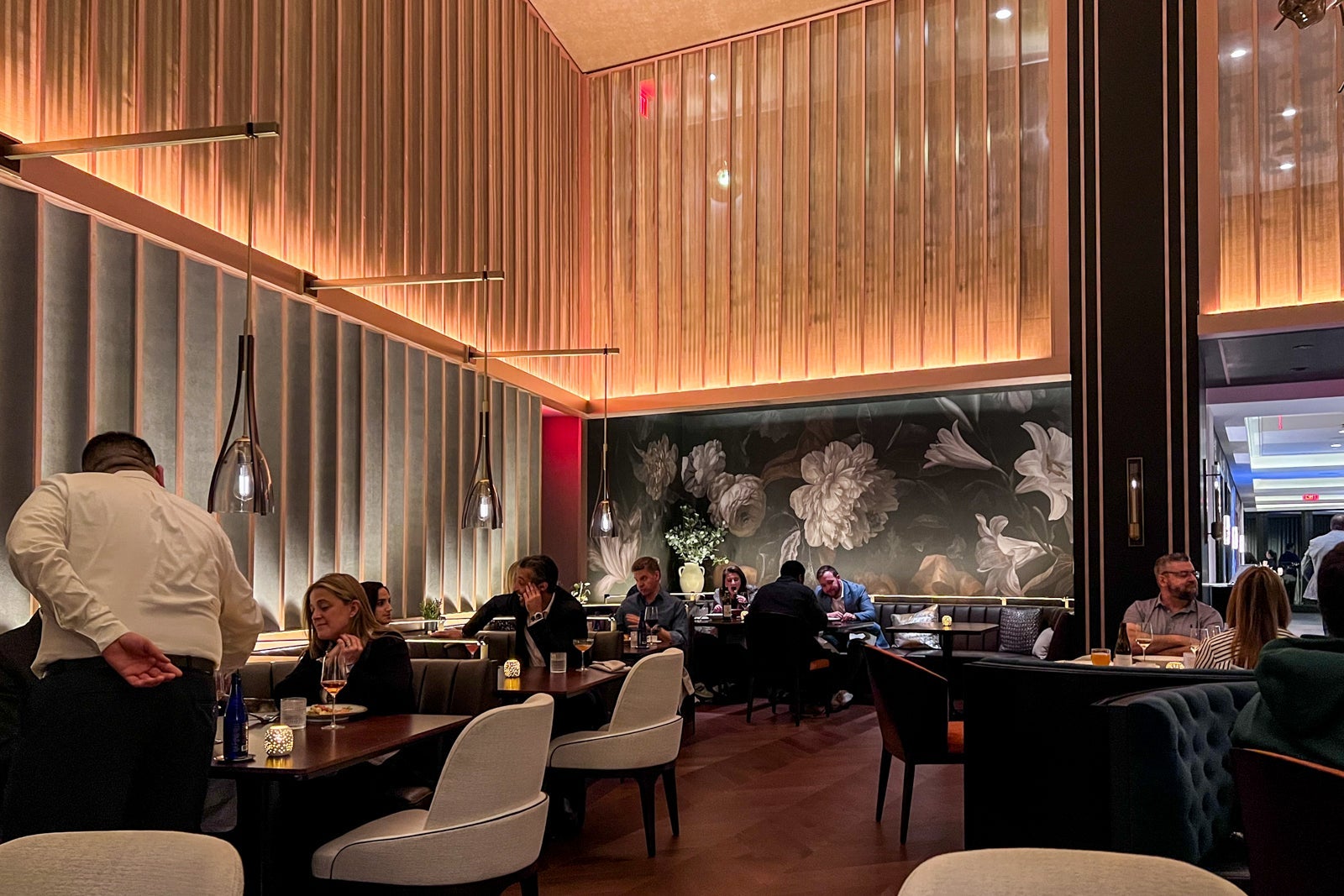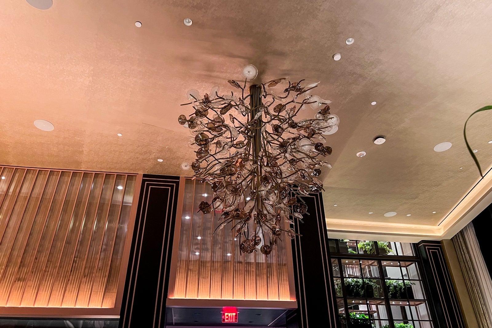 The overall design and style are meant to have subtle nods to Boston: Copper accents throughout are a nod to Paul Revere's copper plating company, while the greenery and lighting are meant to bring the greenery of Back Bay downstairs into the sky.