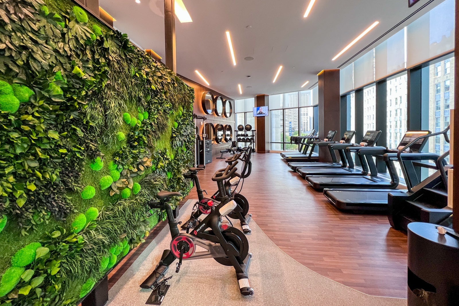 The high ceilings, floor-to-ceiling windows and pop of color thanks to a living green wall make this a gym worth waking up for rather than some of the basement gyms found in other hotels.
