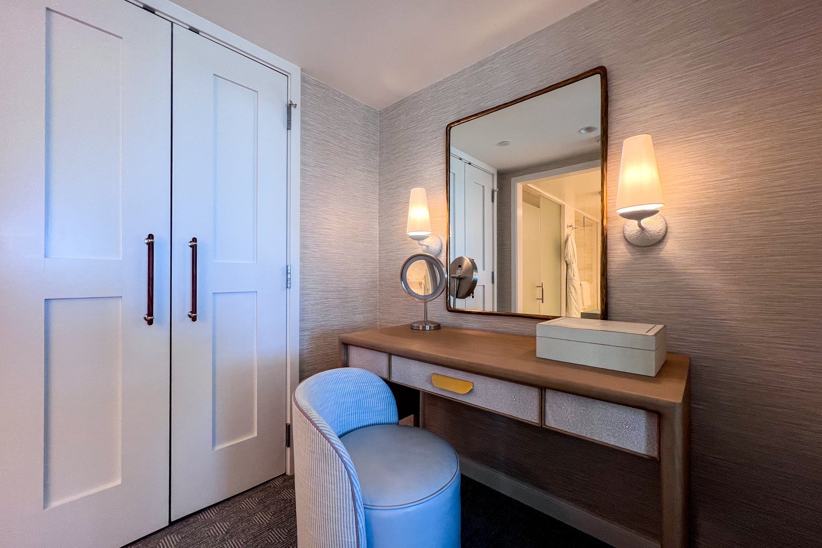 Beyond an archway was the bedroom that featured a king-sized bed with a surprise of monogrammed pillowcases for each of us. There was a small seating area here, as well as large nightstands on either side of the bed with ample places to plug in smartphones and tablets to charge overnight. Another Juliet balcony was just off the bedroom overlooking the ocean, and there were both sheer and blackout curtains to give you as much privacy as you wanted.