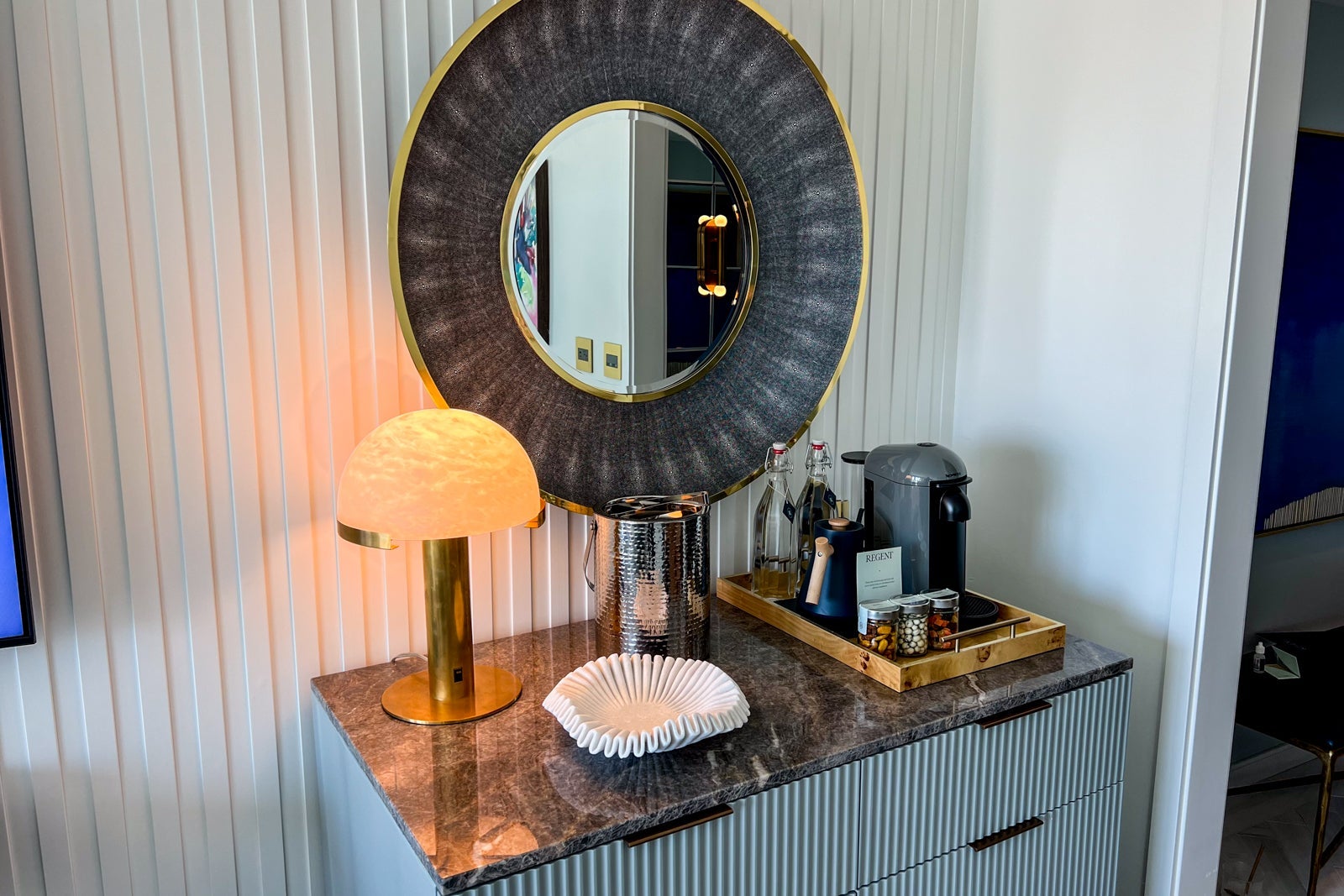 The Oceanfront King guest room featured a living room that included separate seating and dining areas as well as a workstation, flat-screen television (visible from the bedroom) and minibar, er, Refreshment Gallery. There was also a Juliet balcony off the seating area that was perfect for sunrise and sunset photoshoots. The complimentary refreshments in the Refreshment Gallery included things like tahini-spiced nuts, yogurt-covered raisins, Nespresso pods, tea and water.