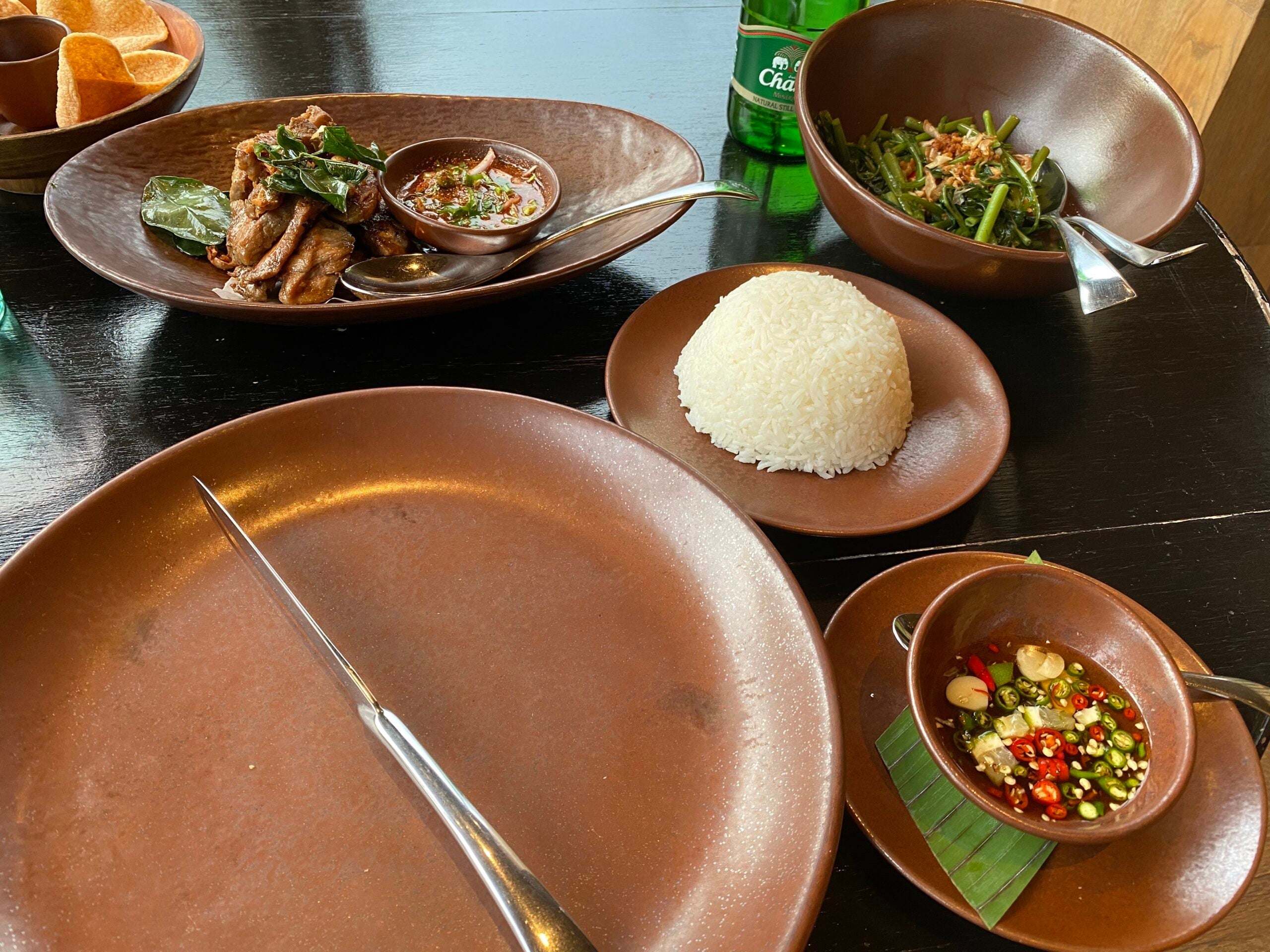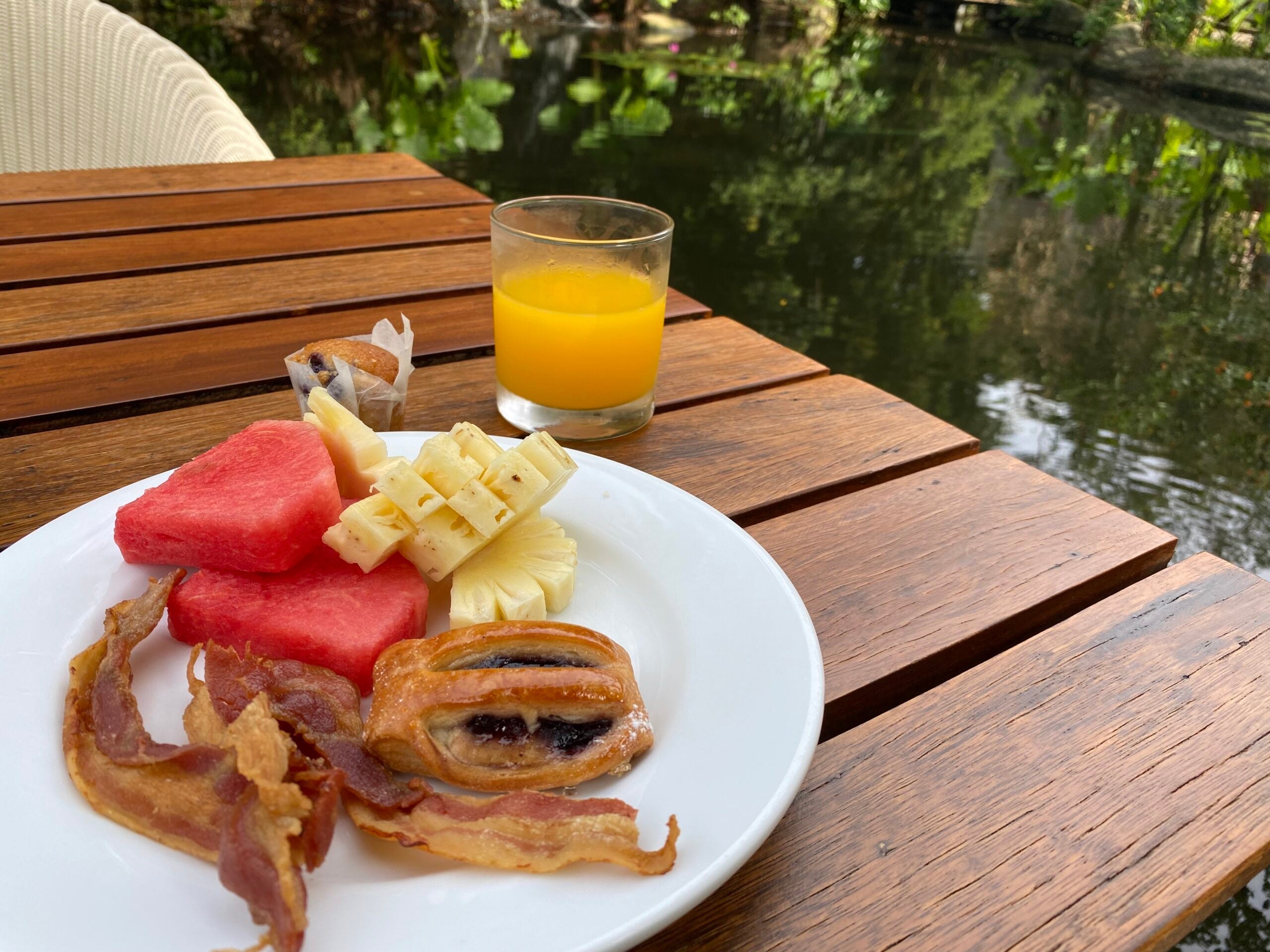 For breakfast, I opted for Loca Vore which serves a mix of Thai and Western food. It is buffet style -- which I'd genuinely thought was a casualty of the pandemic -- but there were gloves at each station. The breakfast options were solid: think egg benedict, bacon, pastries and juice. There's also an outdoor section with views of a small waterfall.