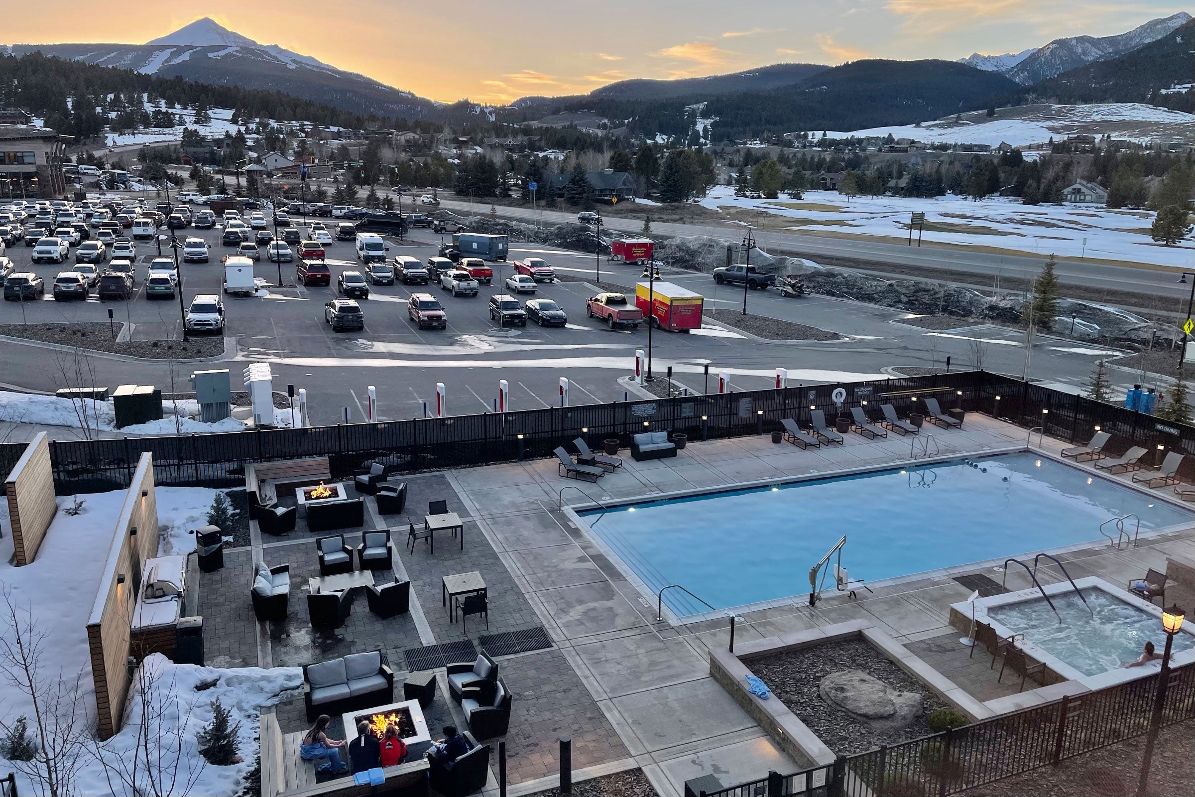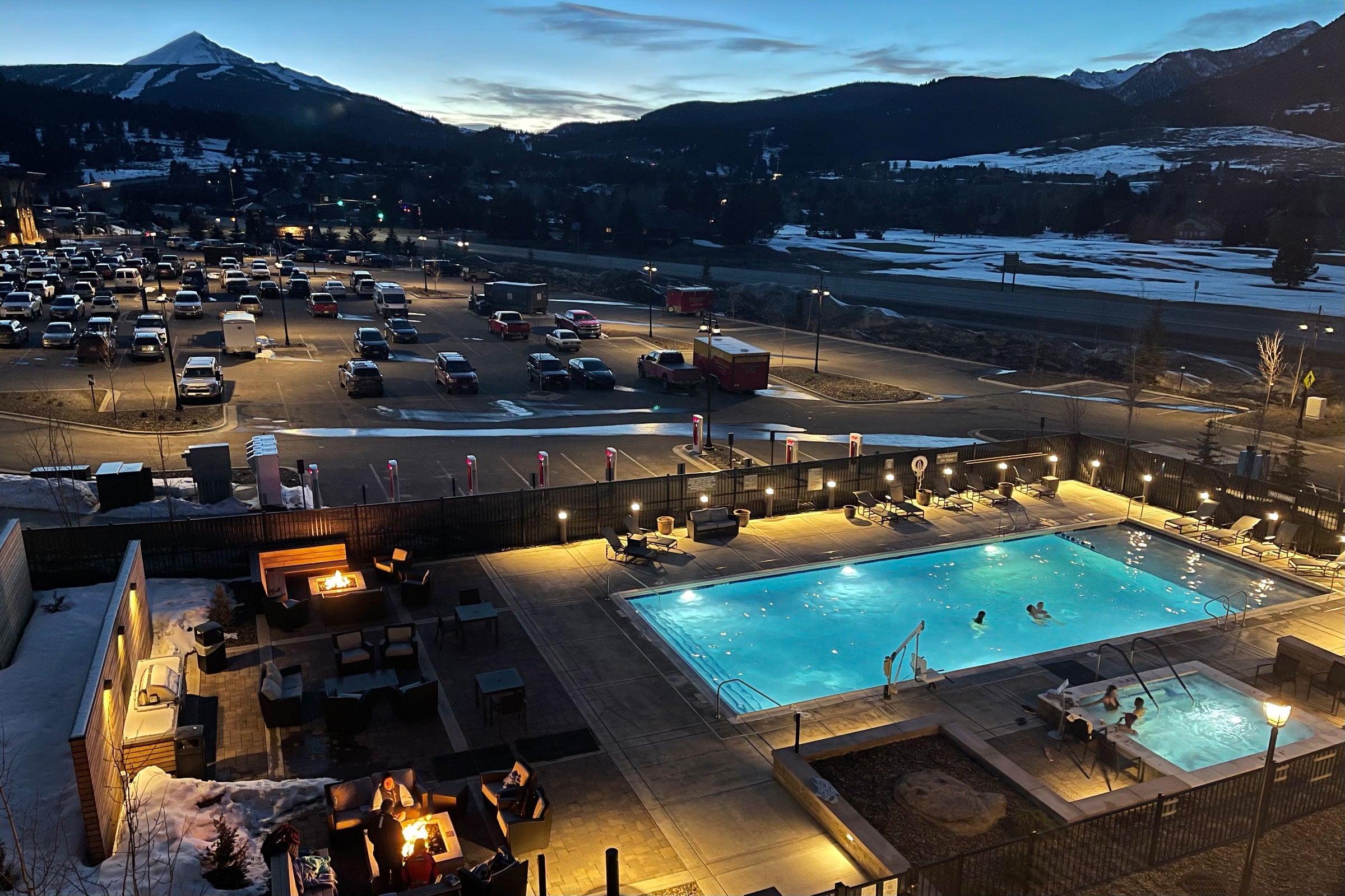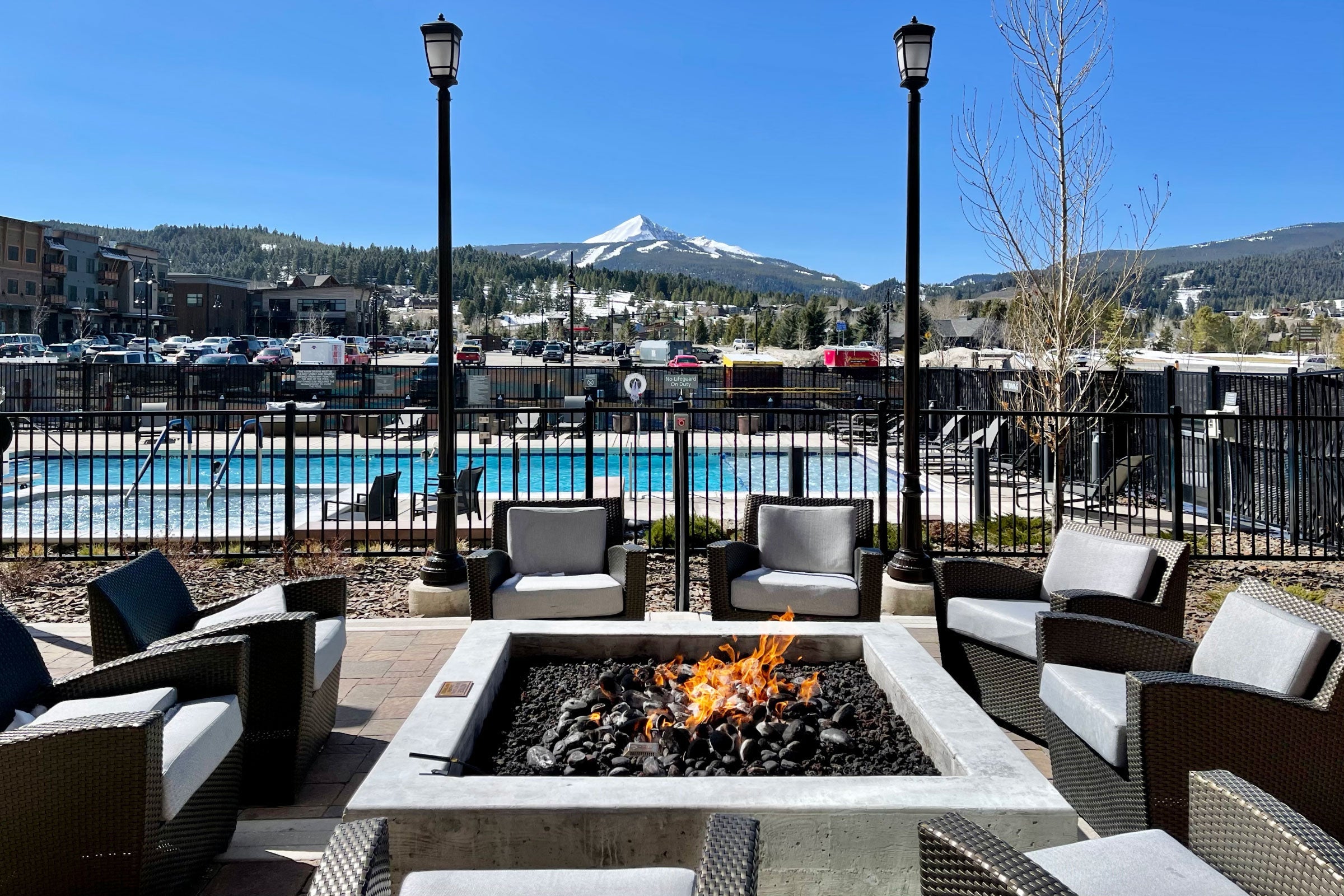 Out back, there are multiple fire pits, each with plenty of seats, along with a large pool and a hot tub. During the pandemic, guests are required to make a reservation to use the hot tub, since it's a fairly compact space, though the rest of the amenities are open.