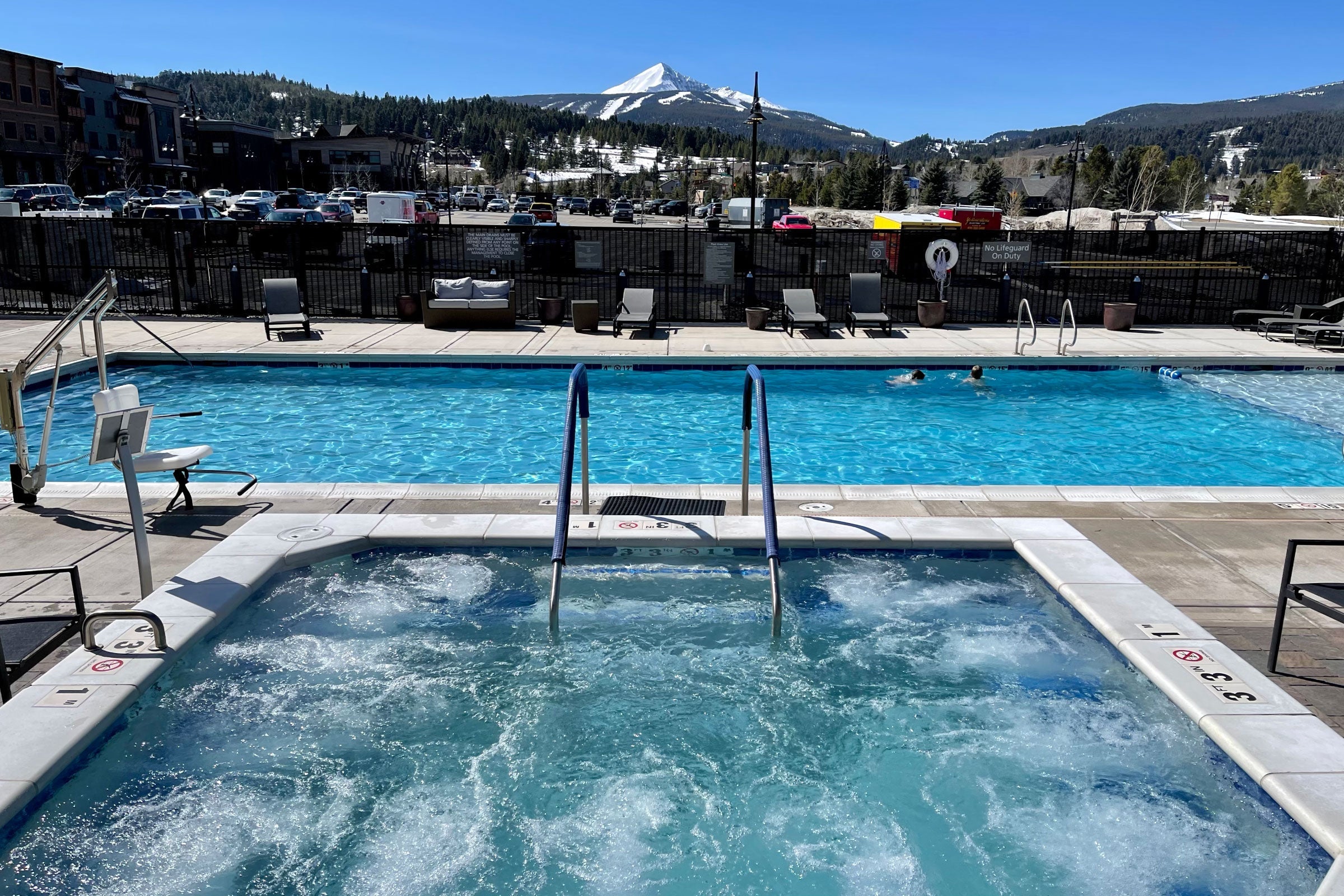 With good road conditions, you can make it to the base of the mountain in just over 10 minutes, and parking is free once you get there. The hotel also offers a free shuttle — if you're planning to use that to get to the slopes, be sure to reserve a spot in advance.