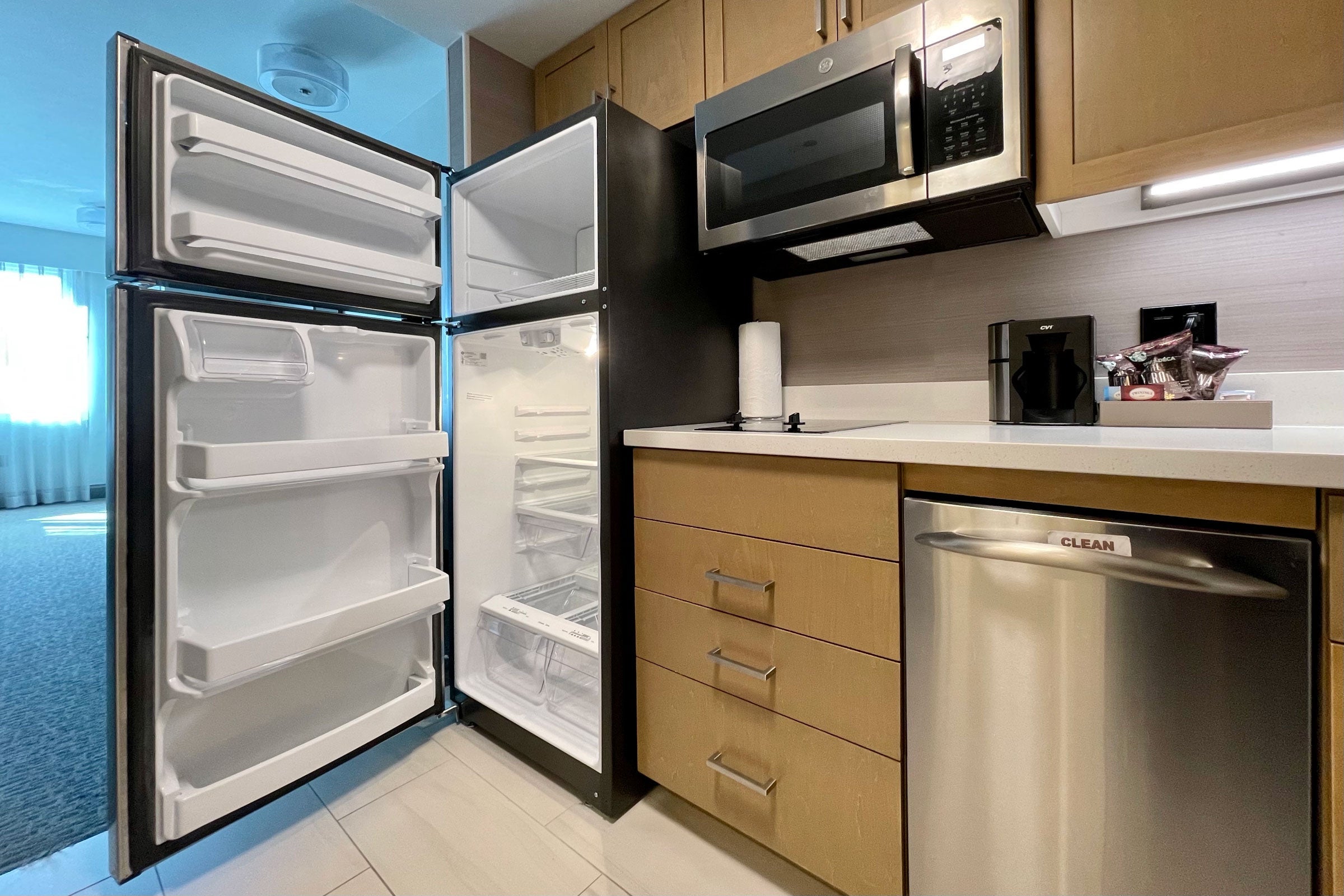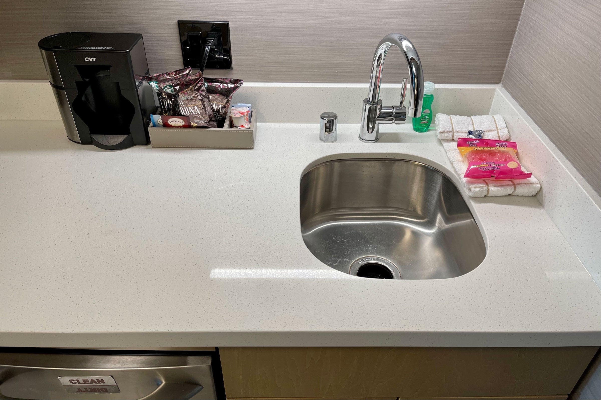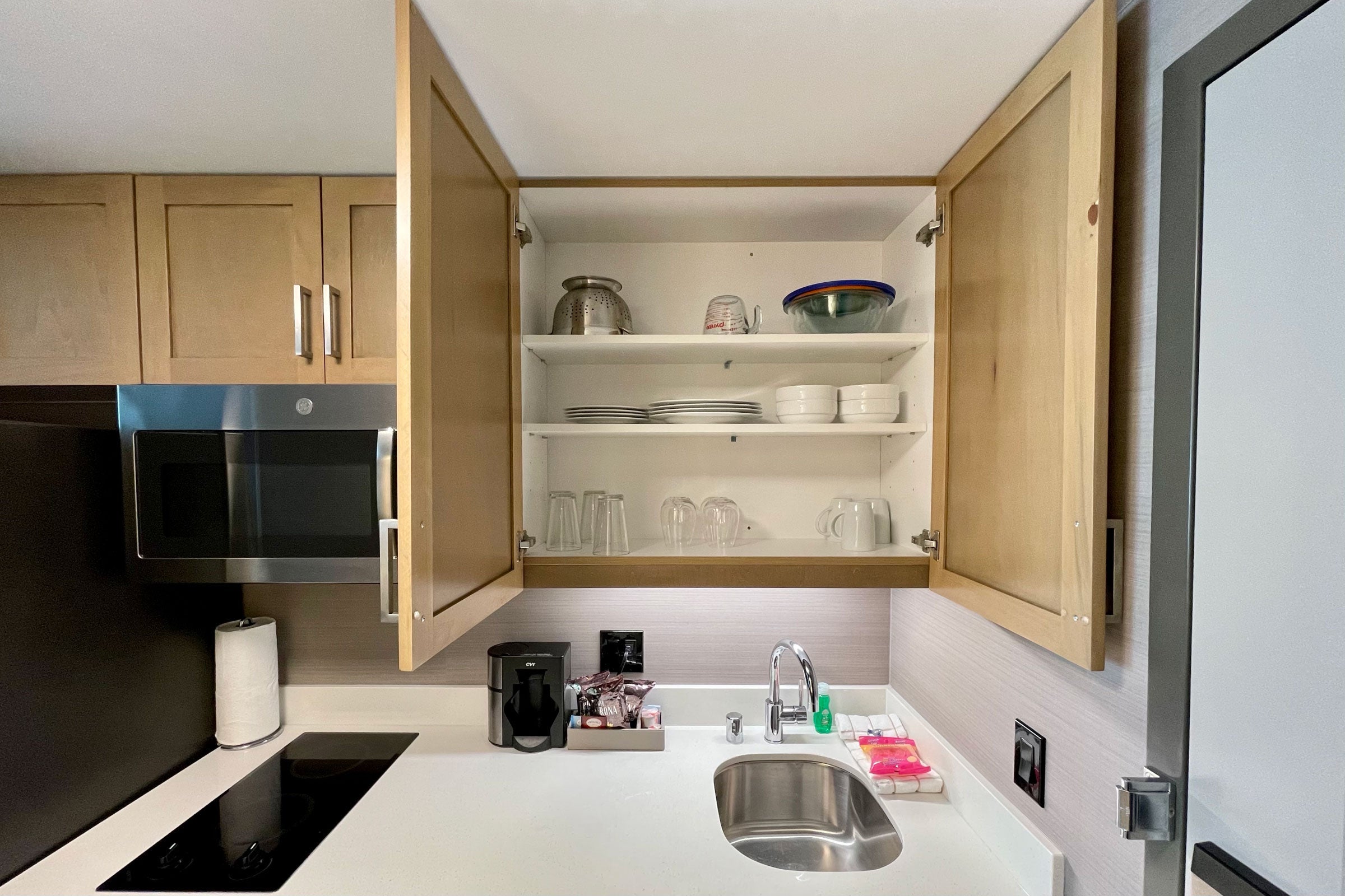 Our room also came with two fresh dishtowels, a new bottle of dish soap and a sealed sponge.