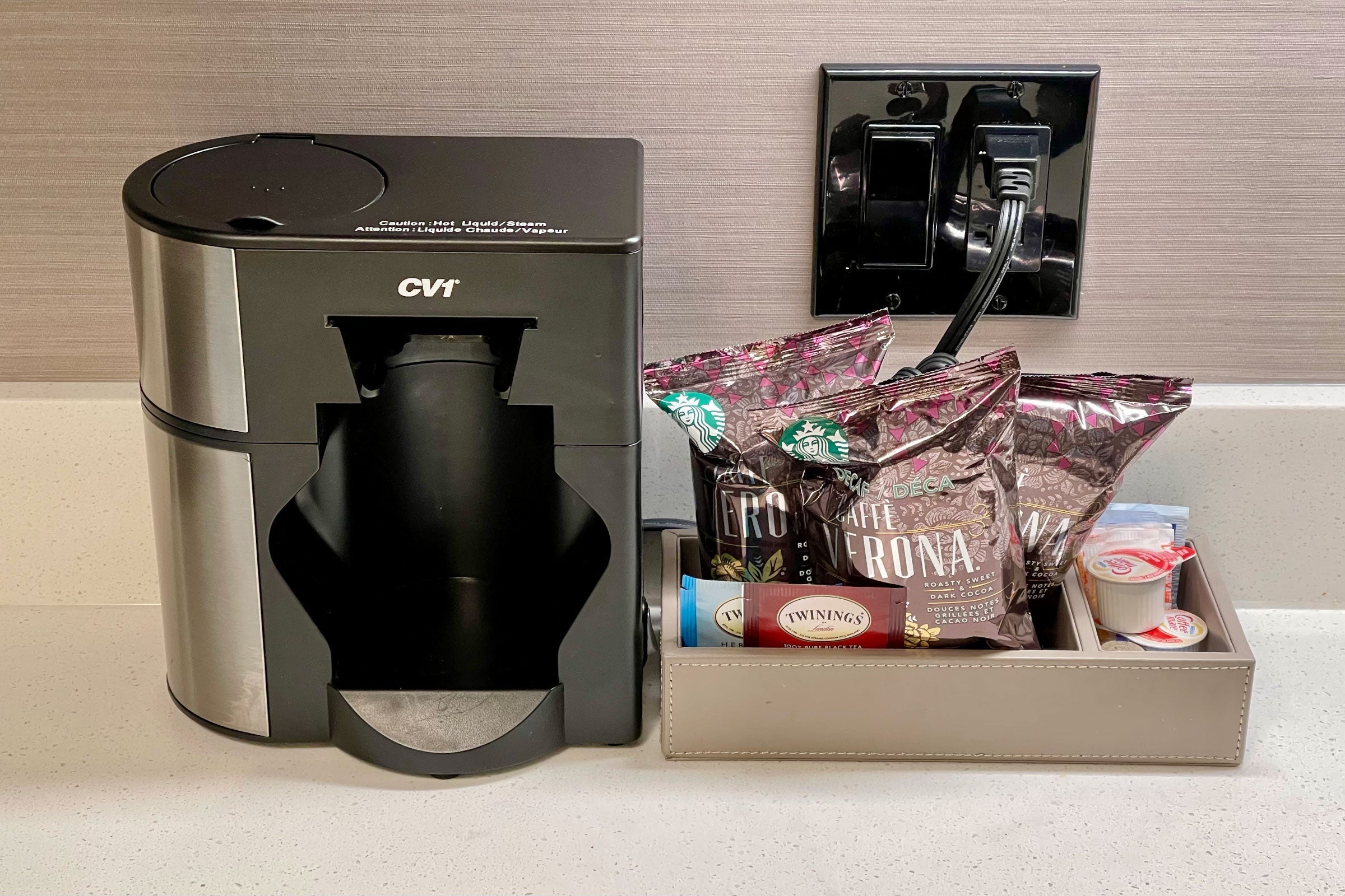 There was also a pod-based coffee maker, with a few Starbucks pods and some Twinings tea.
