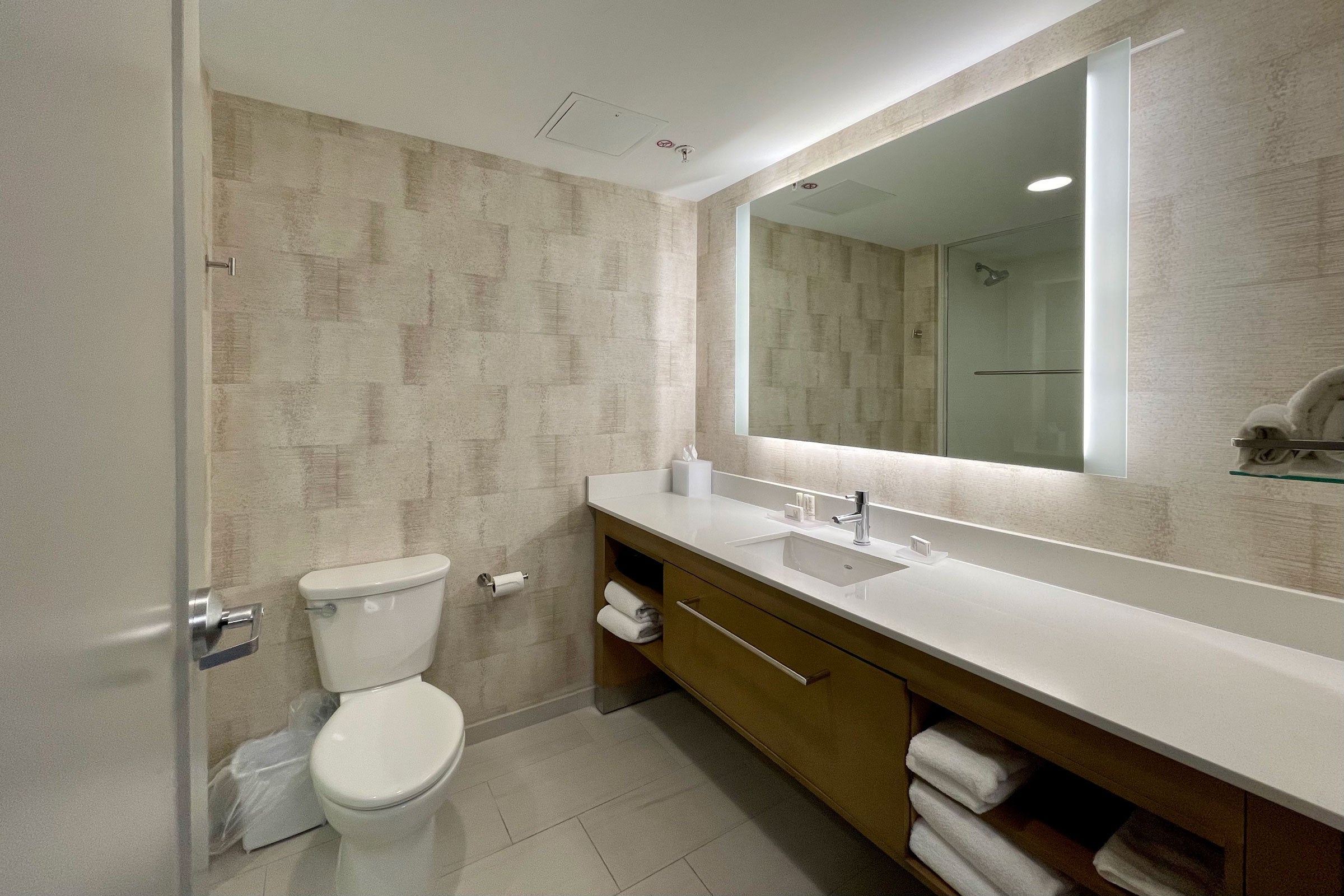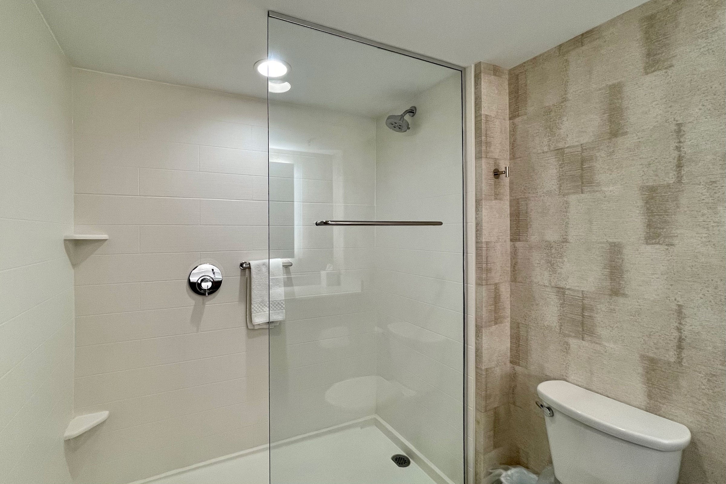 The walk-in shower was large, which I appreciated, but it was terribly designed, with a partition that only extended halfway across, making it impossible to avoid getting water all over the floor.