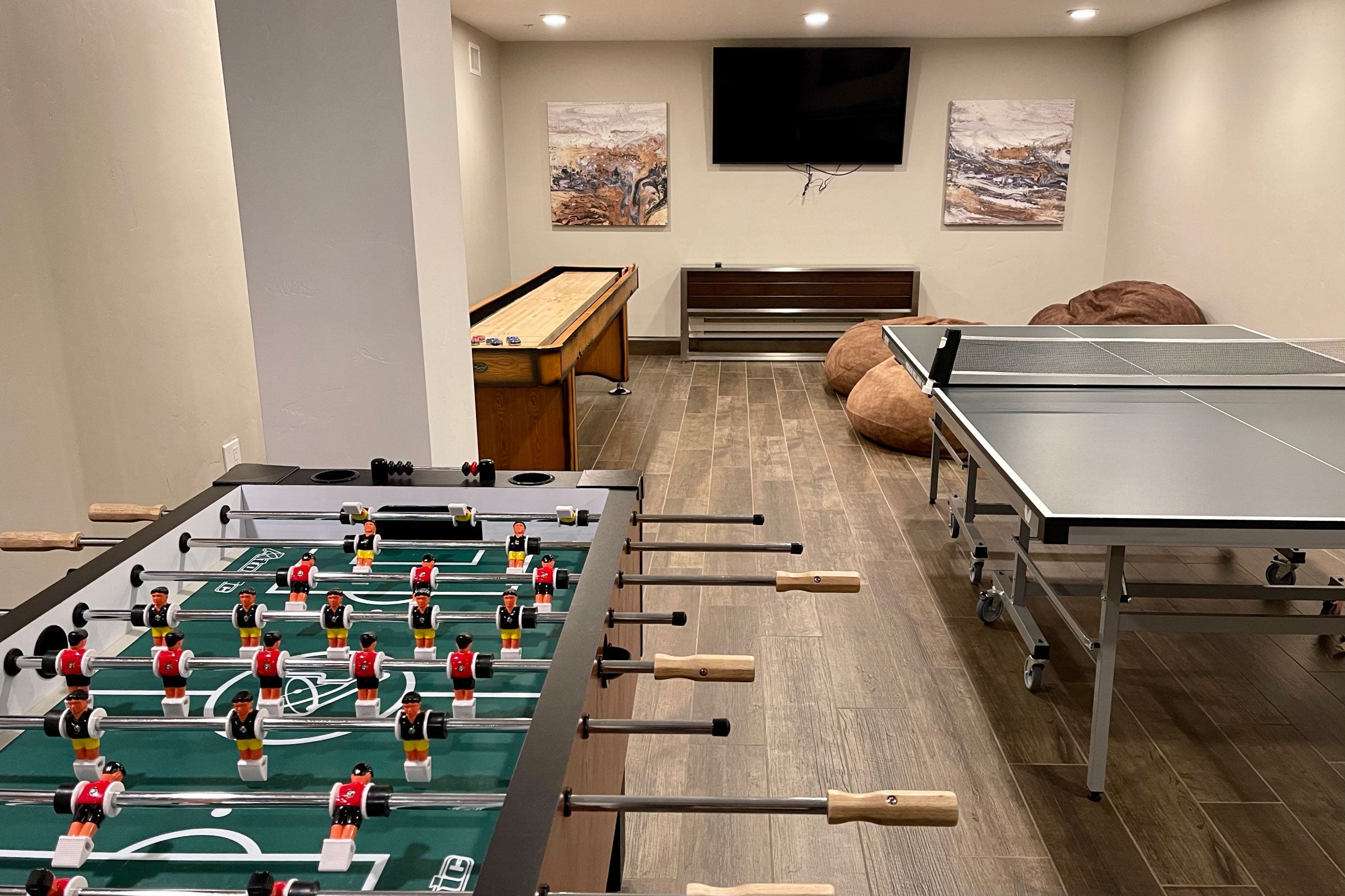 There was also a family room with bean bag chairs in front of a TV, a ping pong table and foosball.