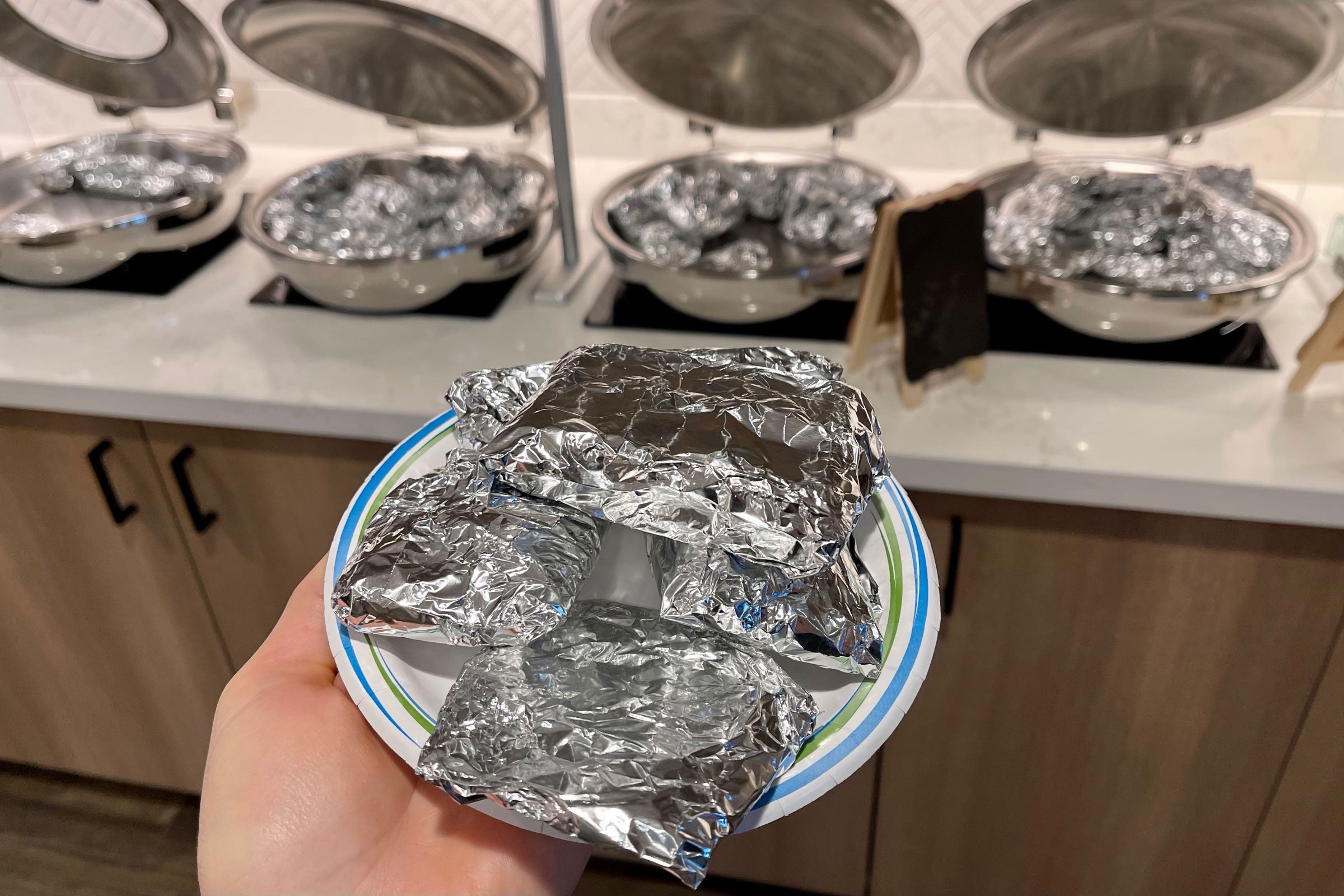 There were "hot" dishes on offer, but they were barely warm, even though they were served in heated buffets and wrapped in aluminum foil.