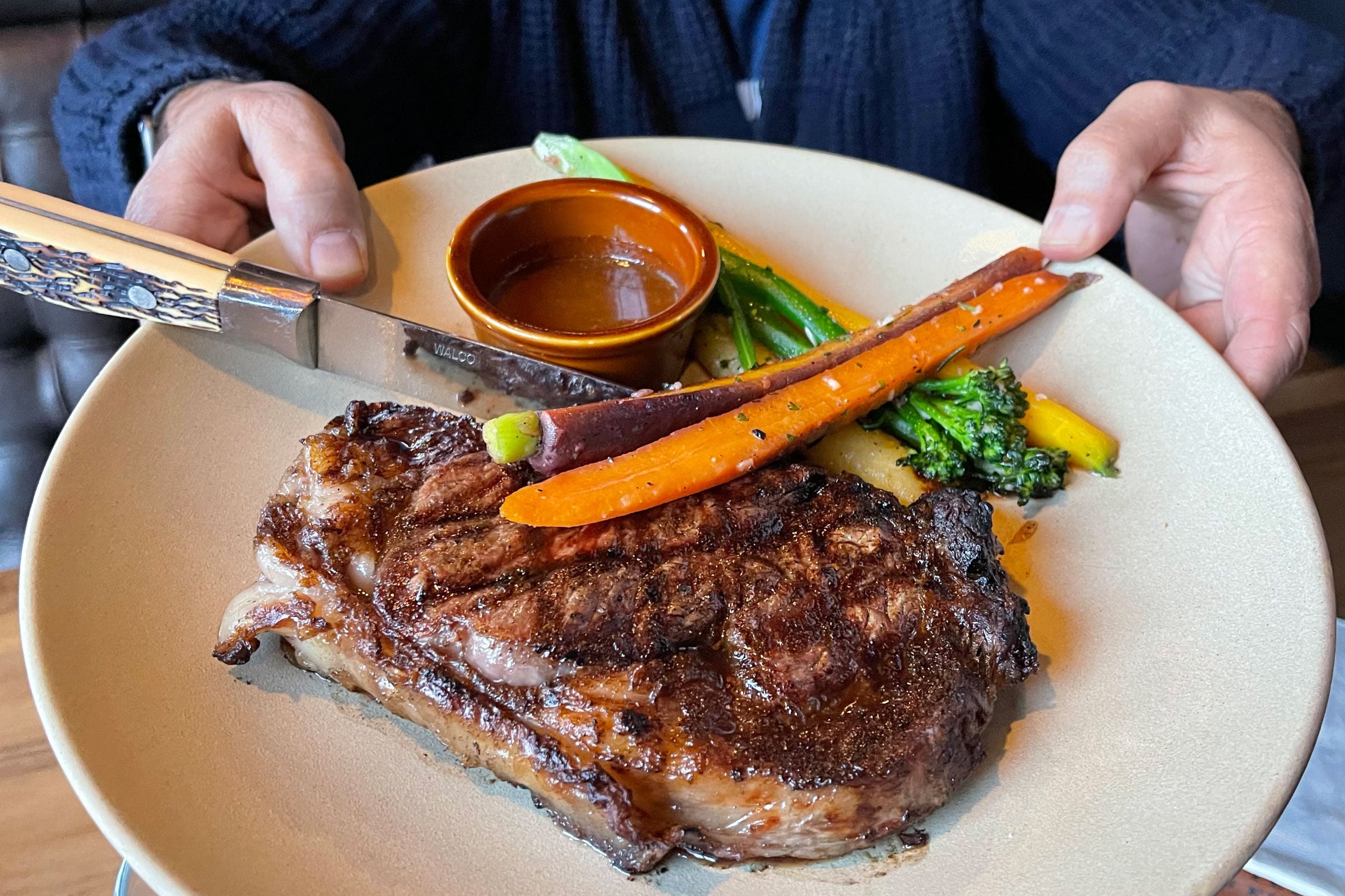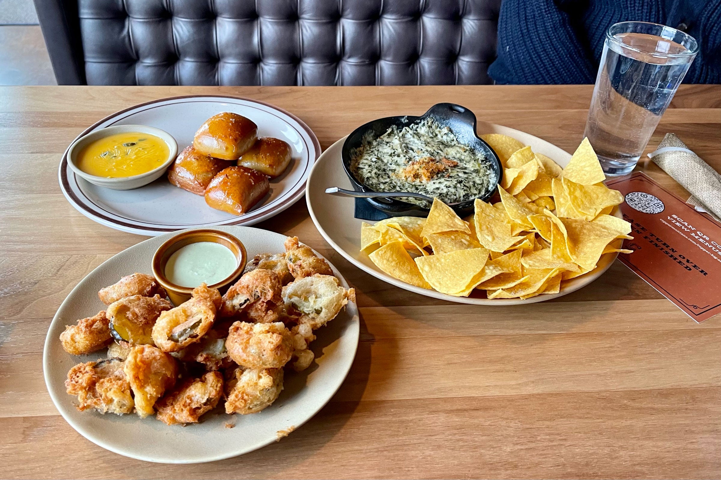 I really enjoyed the happy hour appetizers, including pretzel bites ($6), fried pickles ($8) and spinach artichoke dip ($11), which all came out very quickly. We also ordered some food from the regular menu, including the 16-ounce ribeye below — it was unremarkable and a bit pricey, at $45, but prepared as requested.